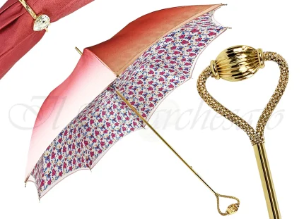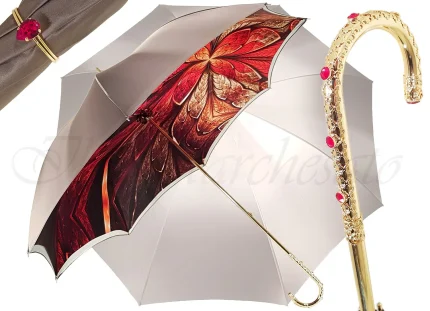 340.00 €Një ombrellë bukuroshe me tendë të dyfishtë e përfunduar me një pëlhurë luksoze prej sateni poliestër të ngjashme me mëndafshin, ajo përmban një mbulesë të jashtme prej pëlhure me hije të kuqe me një dizajn të brendshëm të lulëzuar bukur. Kjo çadër ka një dorezë lëkure, një dorezë të artë të zbukuruar me diamant të rremë Swarovski dhe ka një kornizë manuale ari me një mbyllje elegante.