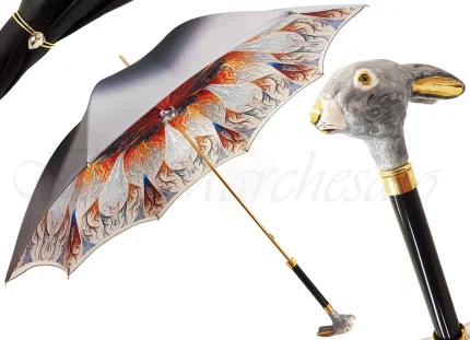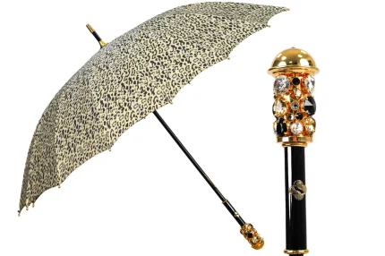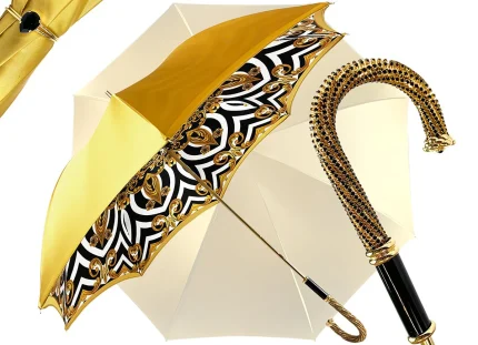 380.00 €Çadra e grave e punuar me dorë , me një mbulesë të jashtme të verdhë ari, vë në dukje dorezën e shijshme të veshur me ar, e pasur me diamant të zi dhe dizajnin e ri fantastik il Marchesato. Çadra është e mbuluar duke përdorur një unazë të bukur floriri, e cila shmang nevojën për një brez kravata.