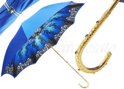 350.00 €Çadër blu femërore e punuar me dorë me stampa të brendshme të lulëzuar dhe dorezë prej bronzi të punuar me flori 24K të punuar me bizhuteri, me qindra kristale safiri.