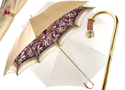 340.00 €Ombrellë luksoze me tendë të dyfishtë me një pjesë të jashtme kremoze, e plotësuar nga një brendshme prej poliester saten që përmban një model abstrakt. Ka një bosht metalik të praruar dhe dorezë të pasur me diamant të rremë Swarovski. Çadra është e mbuluar duke përdorur një unazë të bukur floriri, e cila shmang nevojën për një brez kravata.