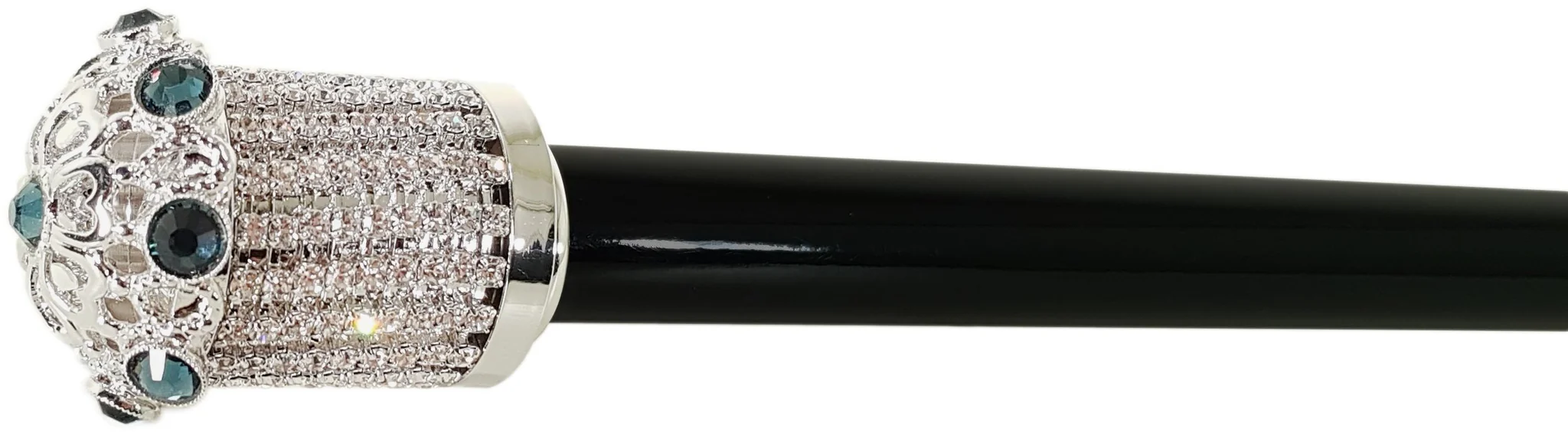 Jeni duke kërkuar për një kallam klasik në mbrëmje? Ky është kallam shumë i bukur dhe elegant i zbukuruar me një unazë inteligjente të veshur me argjend dhe diamant të rremë akuamarin montana Swarovski, ndërsa doreza e bukur është montuar në një bosht druri të fortë me llak të zi. Kjo pamje mbresëlënëse e bën atë një aksesor të shkëlqyer për dasma zyrtare, gara dhe dalje në mbrëmje.