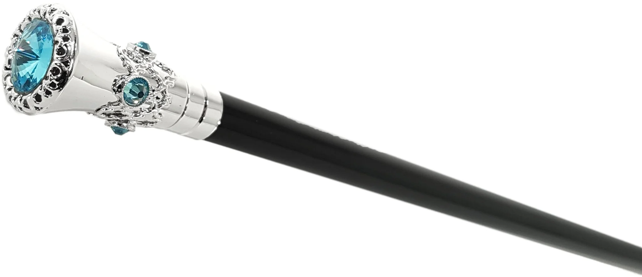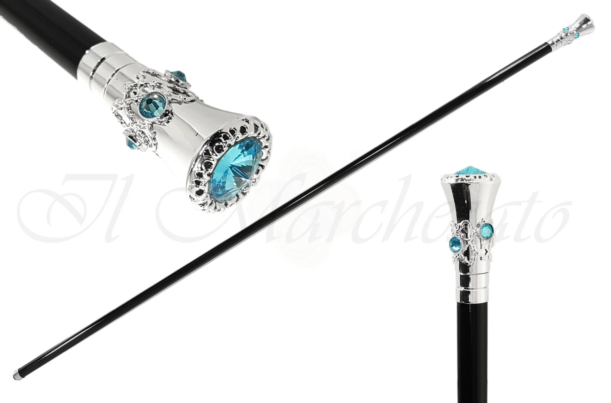 Shkop elegant i përshtatshëm për të gjitha llojet e ceremonive, pullë e veshur me argjend, e veshur me elementë Swarovski. Është gjithmonë kënaqësi të përdorësh këtë xhevahir, një dhuratë e shkëlqyer. Nuk i duron pesha të rënda Bosht druri ahu i zi me llak, me majë metalike.