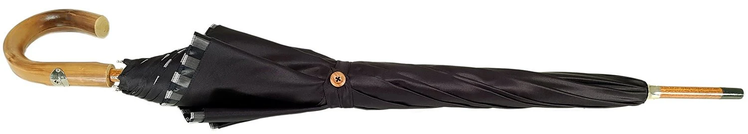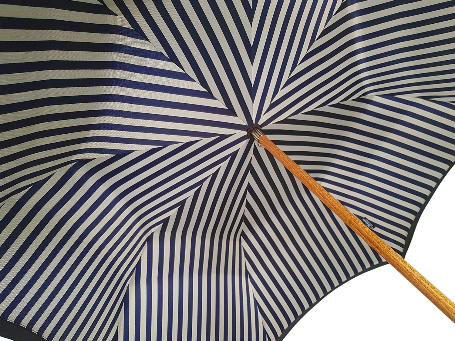 Kjo ombrellë me pëlhurë të dyfishtë Il Marchesato përmban një brinjë me tendë 63 cm. Mbulesa e jashtme elegante prej sateni e bën këtë një ombrellë elegante, vini re pëlhurën e shijshme të brendshme me dizajn blu me vija dhe dorezën e madhe të drurit të gështenjës që e bëjnë atë një pjesë të vërtetë. Një kënaqësi për ta përdorur atë në shi.
