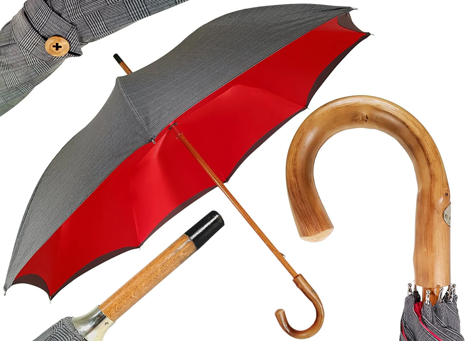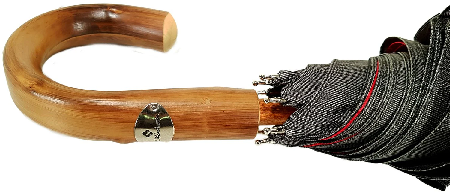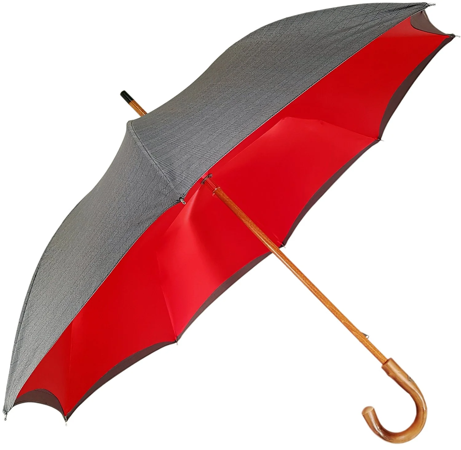 Kjo ombrellë me pëlhurë të dyfishtë Il Marchesato përmban një brinjë me tendë 63 cm. Mbulesa e jashtme elegante prej pambuku gri e bën këtë një ombrellë elegante, vini re pëlhurën e shijshme të brendshme prej sateni dhe dorezën e madhe të drurit të gështenjës që e bëjnë atë një copë të vërtetë. Një kënaqësi për ta përdorur atë në shi.
