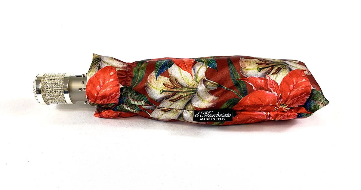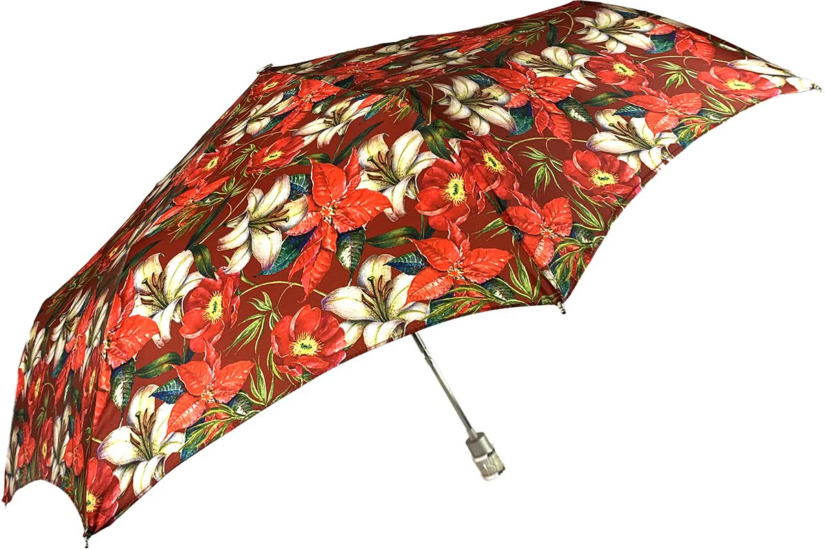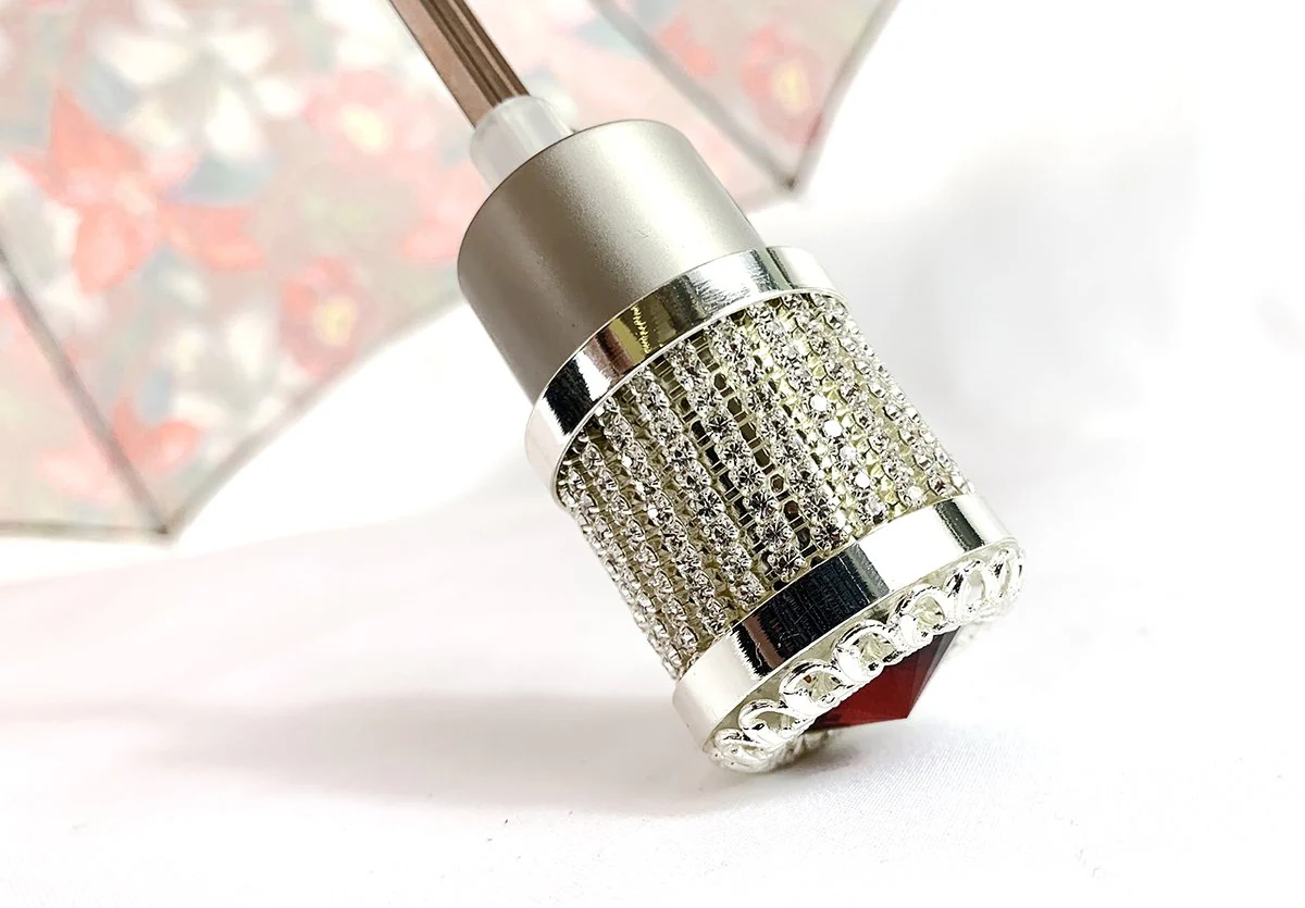 Dizajni ekskluziv me lule i adhurueshëm i ombrellës së lehtë, vlen të përmendet doreza e shijshme prej bronzi e zbukuruar me argjend, e zbukuruar me një gur të madh të kuq Swarovski. Është një ombrellë e lezetshme e modës dhe udhëtimit për zonjat.