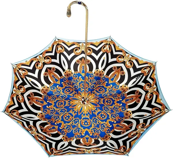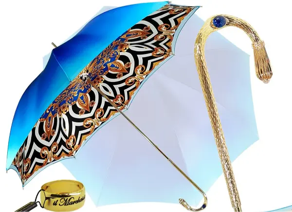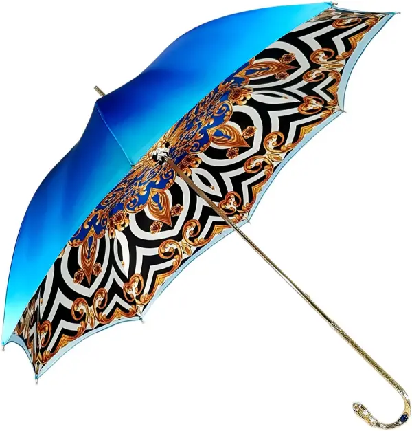 Një ombrellë e shkëlqyer me tendë të dyfishtë e përfunduar me një pëlhurë luksoze poliestër sateni të ngjashme me mëndafshin, ajo përmban një mbulesë të jashtme prej pëlhure me hije blu me dizajn të brendshëm fantastik. Dorezë e re e bukur, është projektuar dhe krijuar nga mjeshtrit tanë. Dhe ka një kornizë manuale ari me një mbyllje elegante. Data e publikimit të parë 27.06.2018)