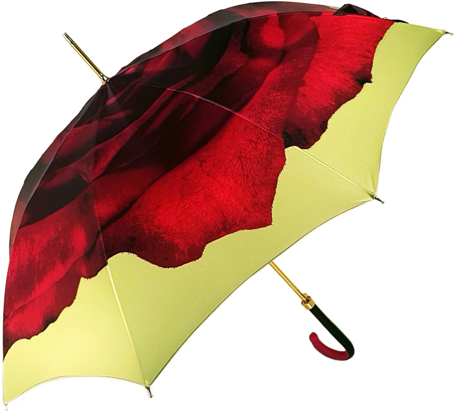 Çadër e bukur e punuar me dorë me bosht ari dhe brinjë tekstil me fije qelqi. Dorezë lëkure dyngjyrëshe.