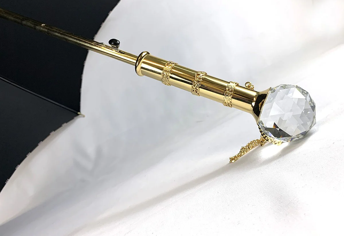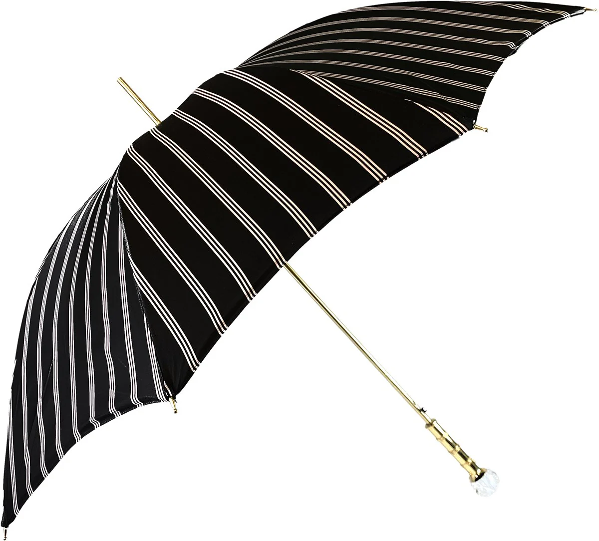 Kjo ombrellë elegante me vija zotërinjsh, e bërë në Itali nga dizajnerët il Marchesato. Elegancë dhe elegante, kjo ombrellë ka një mbulesë të bërë nga poliesteri më i mirë italian. Kornizë me fije hapëse automatike dhe në krye është një kristal i madh Swarovski.