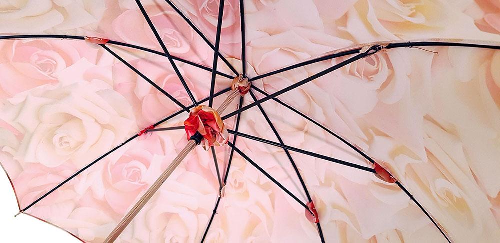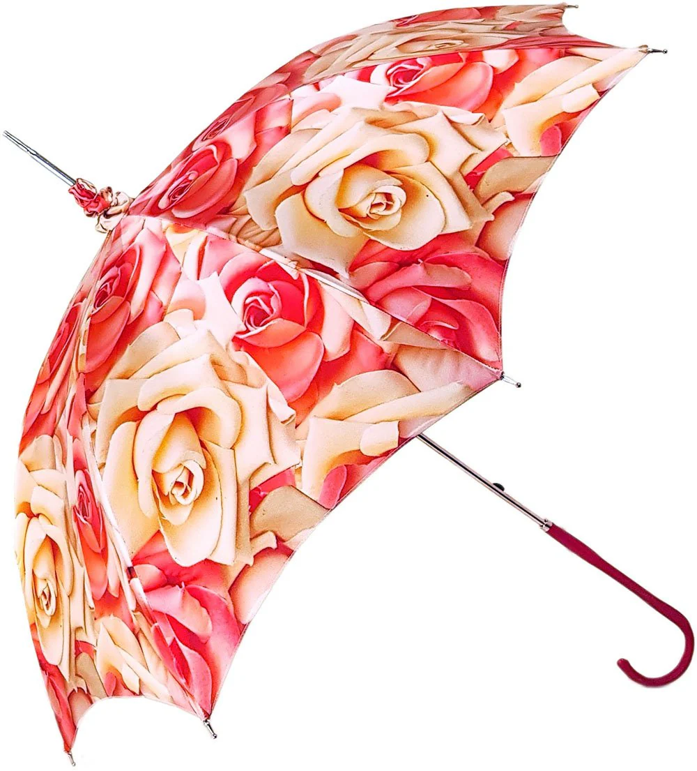 Ombrellë dielli ombrellë për femra me trëndafila të bukur të stampuar, dorezë lëkure e kuqe.