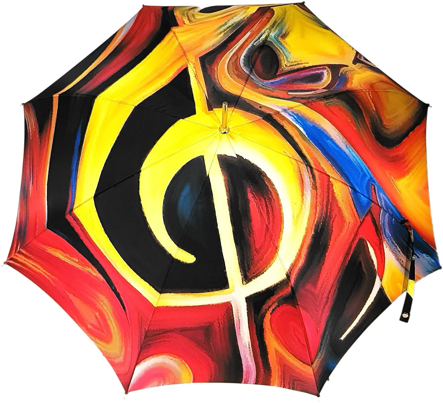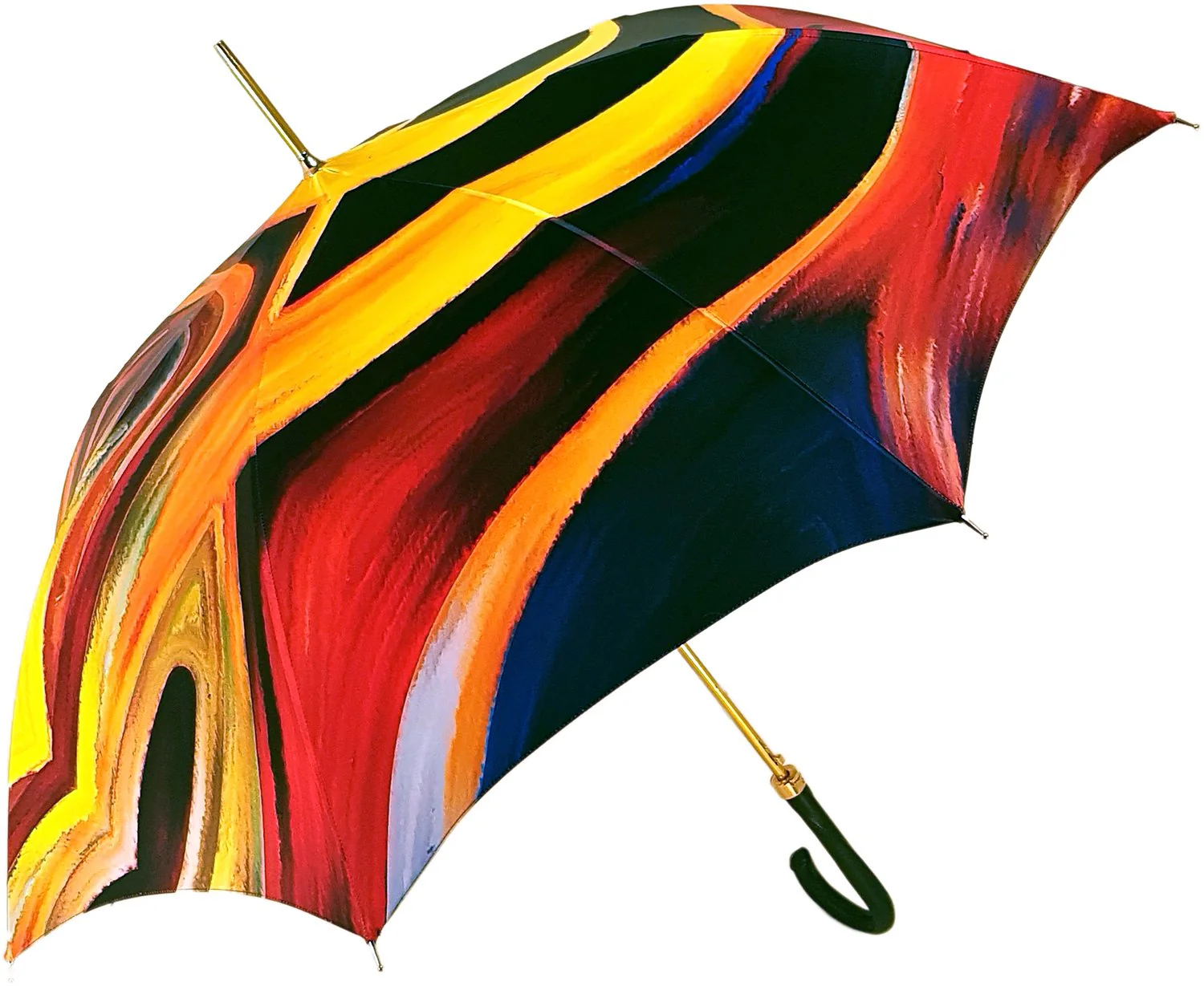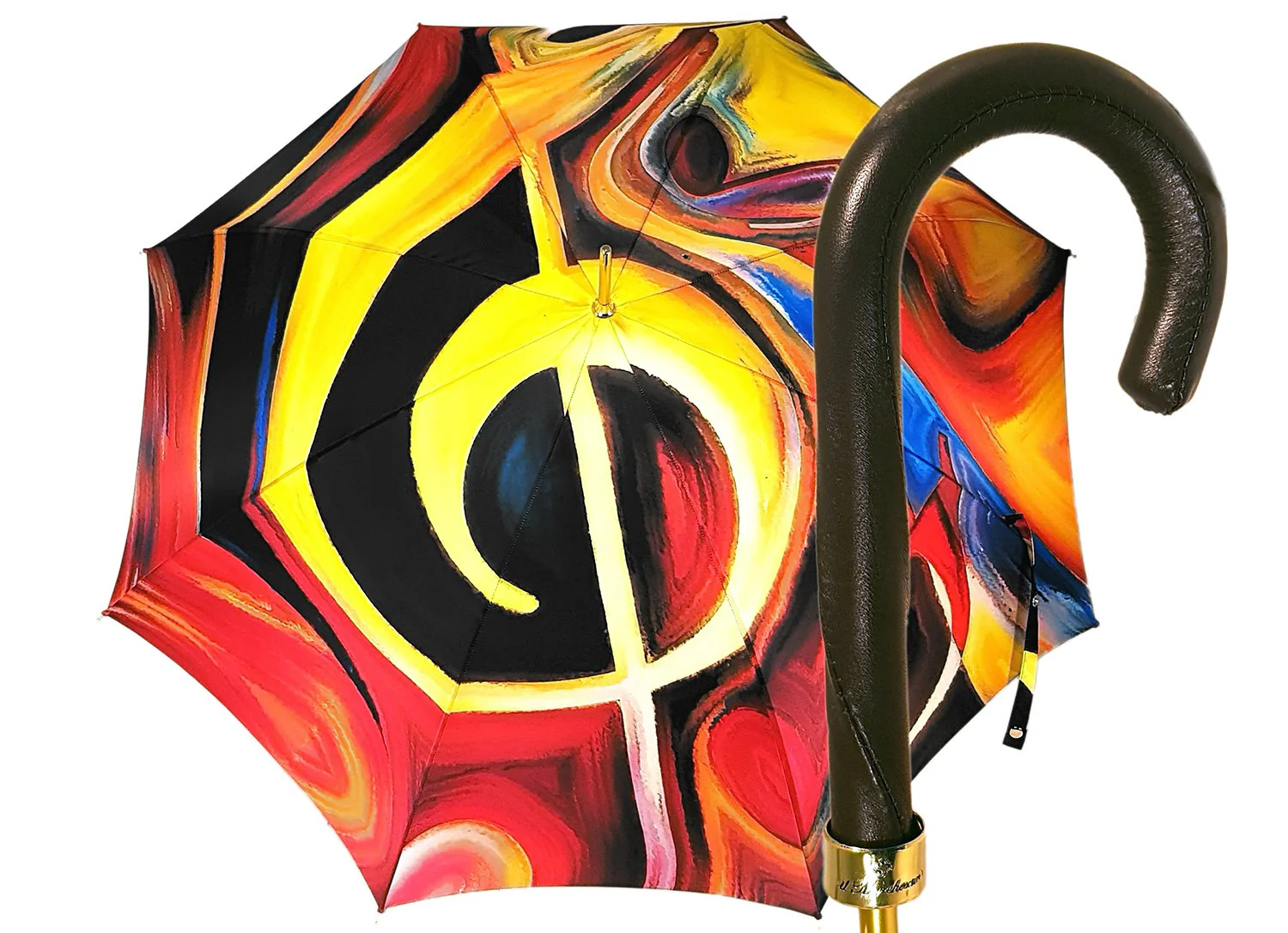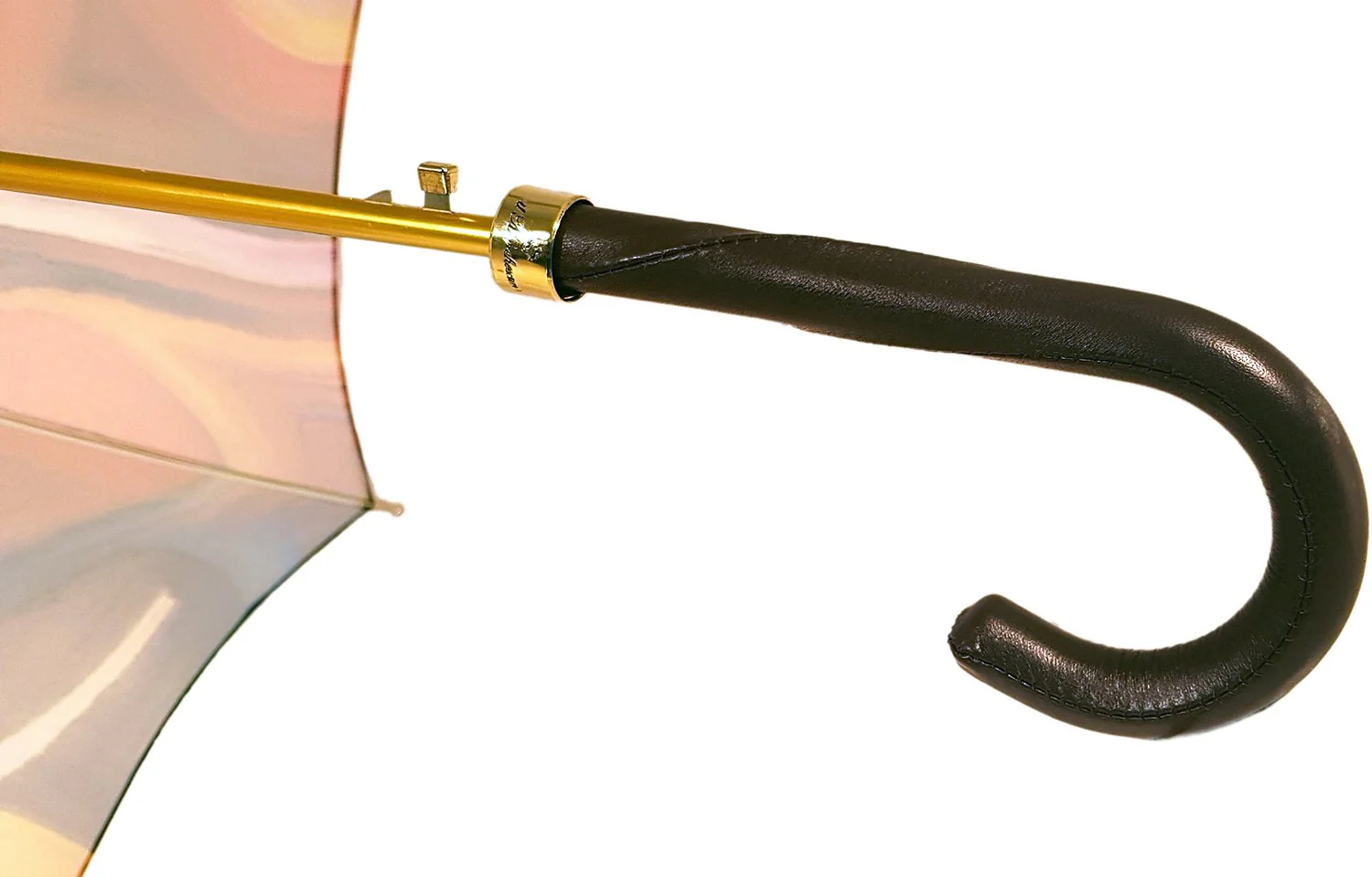 Çadër e bukur e punuar me dorë me bosht ari dhe brinjë tekstil me fije qelqi. Dorezë lëkure kafe.