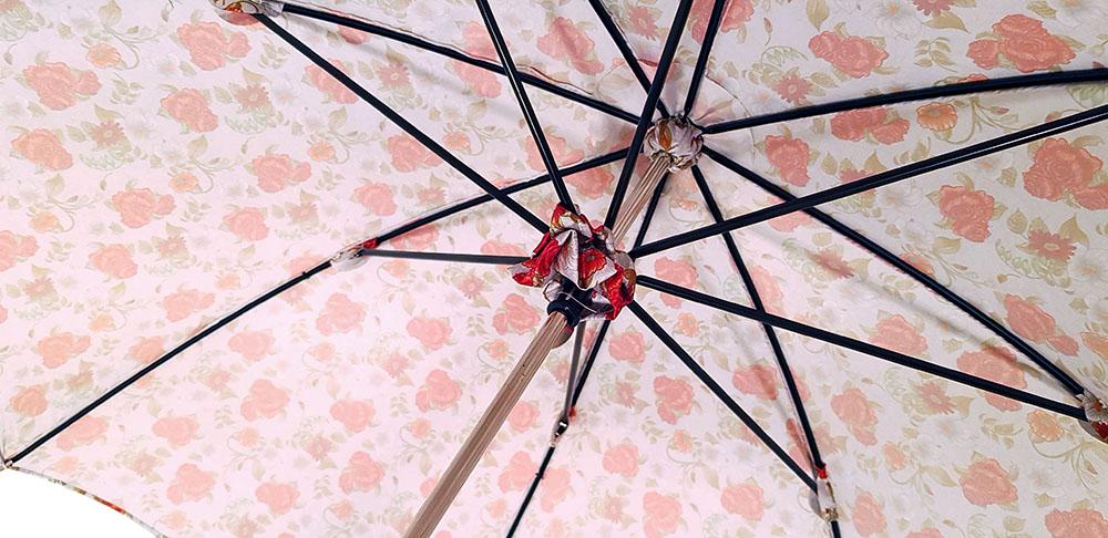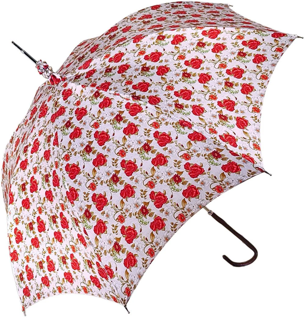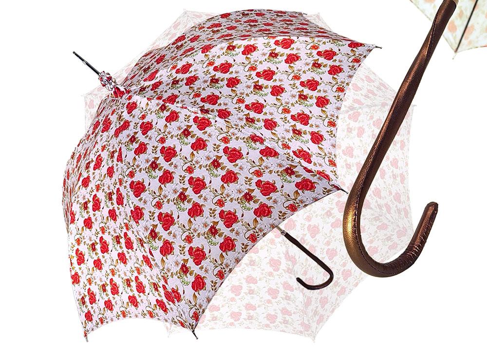 Çadër dielli ombrellë për femra me trëndafila të kuq të bukur dhe dorezë lëkure prej bronzi.