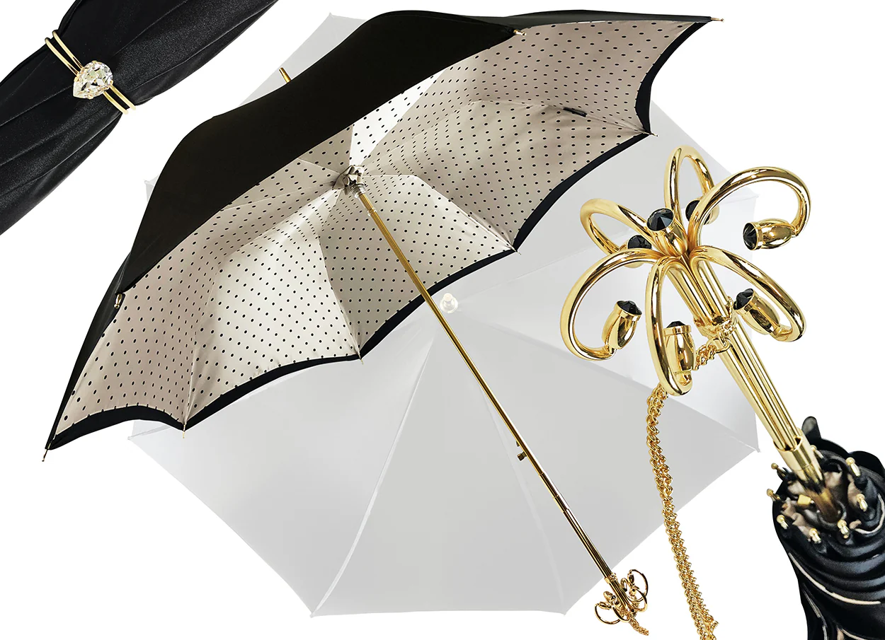 Ombrellë për femra nga koleksioni ynë Premium me pika klasike të zeza dhe krem brenda, saten i zi jashtë
