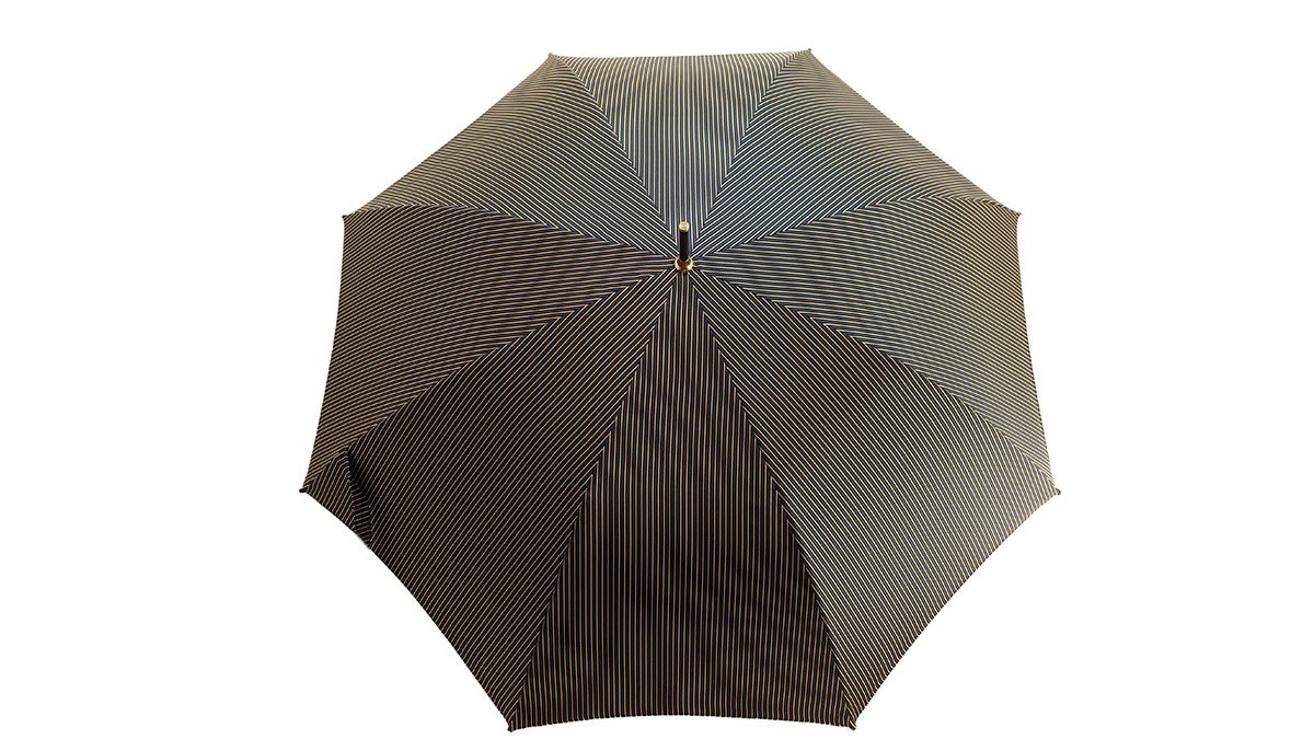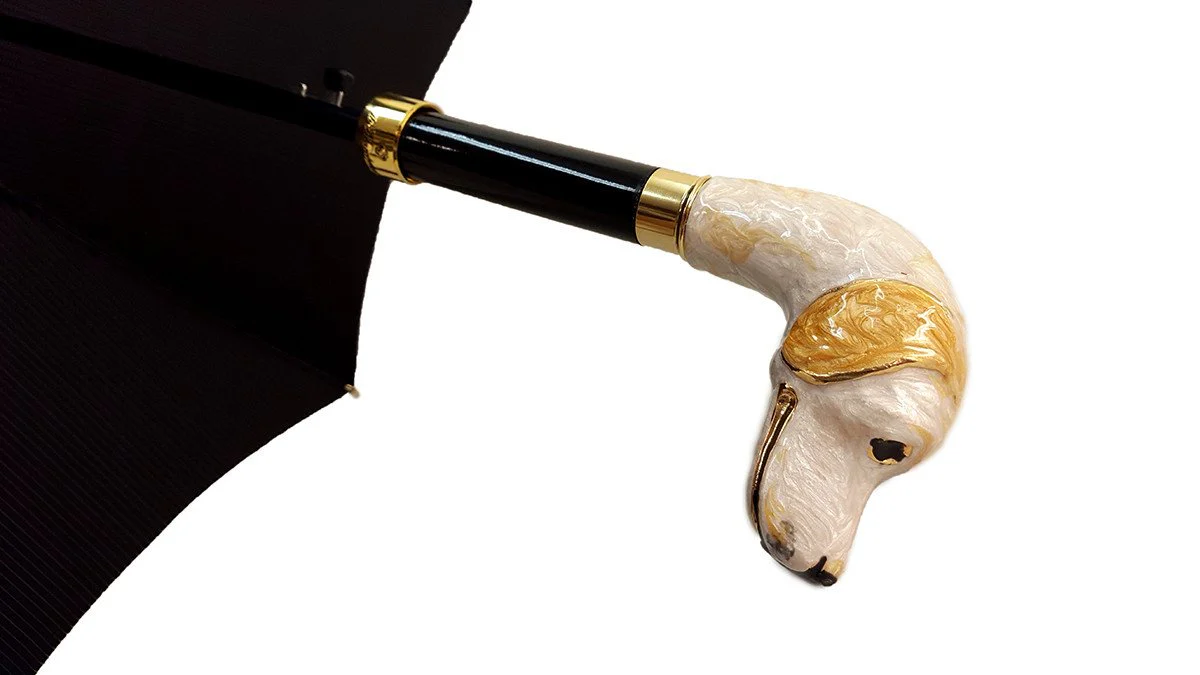 Kjo ombrellë elegante dhe e çmuar për zotërinj është bërë nga poliesteri më i mirë italian. Kjo ombrellë klasike ka një kornizë fibra automatike me hapje me ngjyrë të zezë dhe përmban një dorezë elegante, të veshur bukur me ar, të emaluar në formë qeni.