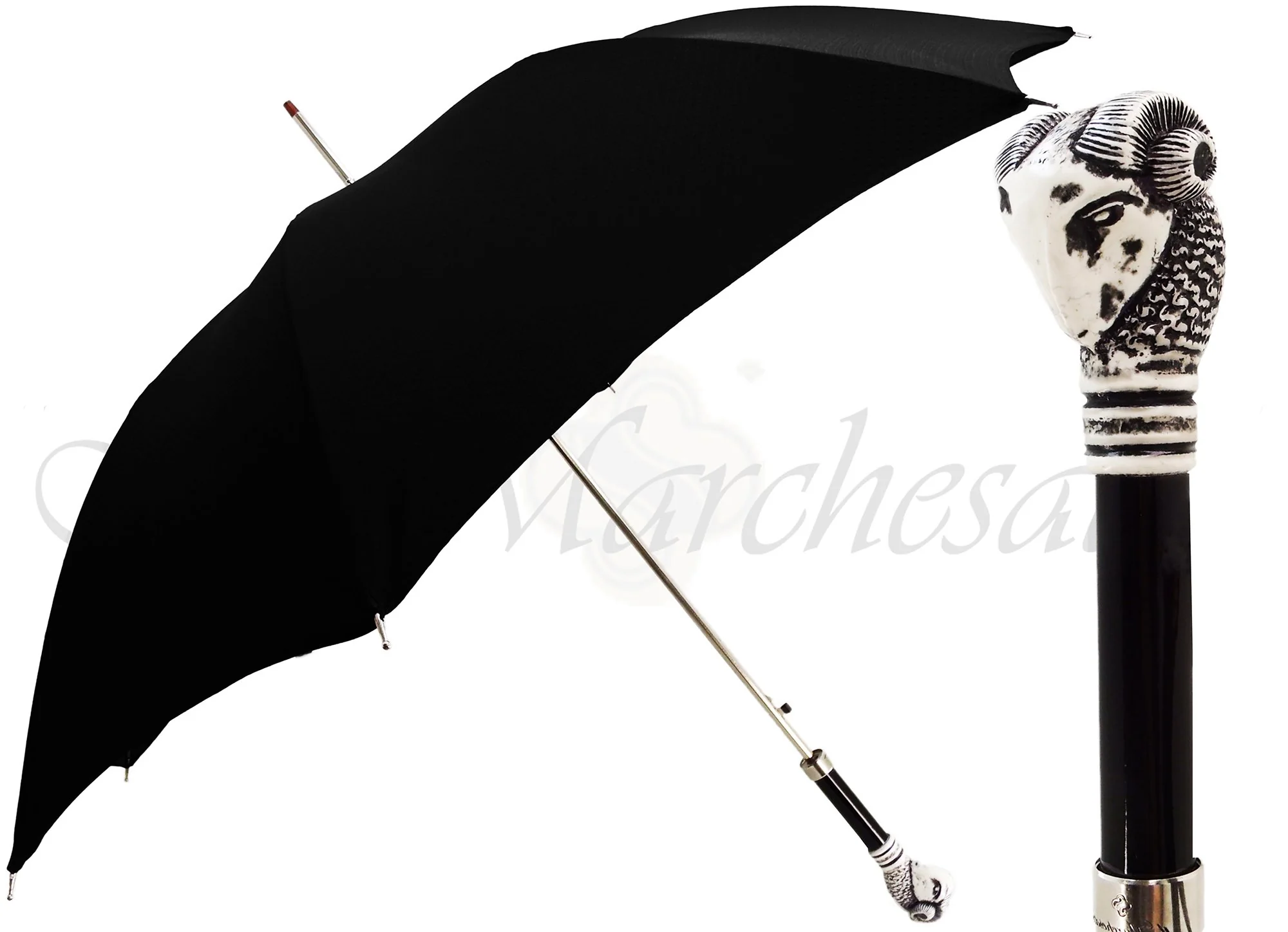 Kjo çadër elegante e zezë për zotërinj është ideale për ata që kërkojnë diçka pak më ndryshe. Tejet elegant, kjo ombrellë ka një tendë të bërë nga poliesteri më i mirë italian. Ai gjithashtu përmban një kornizë metalike me hapje automatike me ngjyrë argjendi dhe në krye është një kafkë e punuar bukur me kokë, e ngulitur me qindra kristale Swarovski.