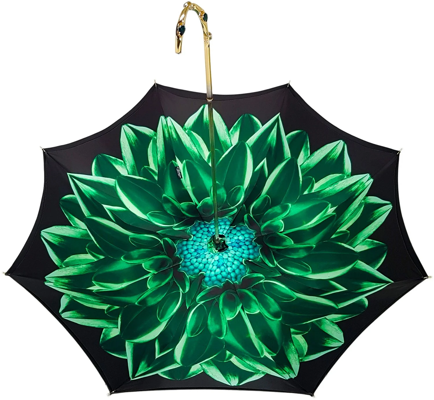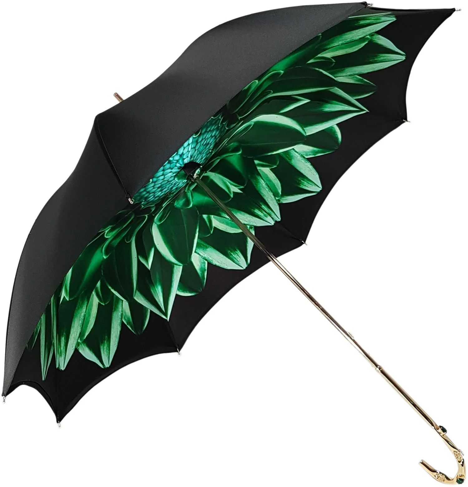 Çadër e mrekullueshme për femra e punuar me dorë, e përfunduar me një pëlhurë të hollë poliester sateni të zezë, me një dizajn ekskluziv me lule jeshile të printuar brenda .