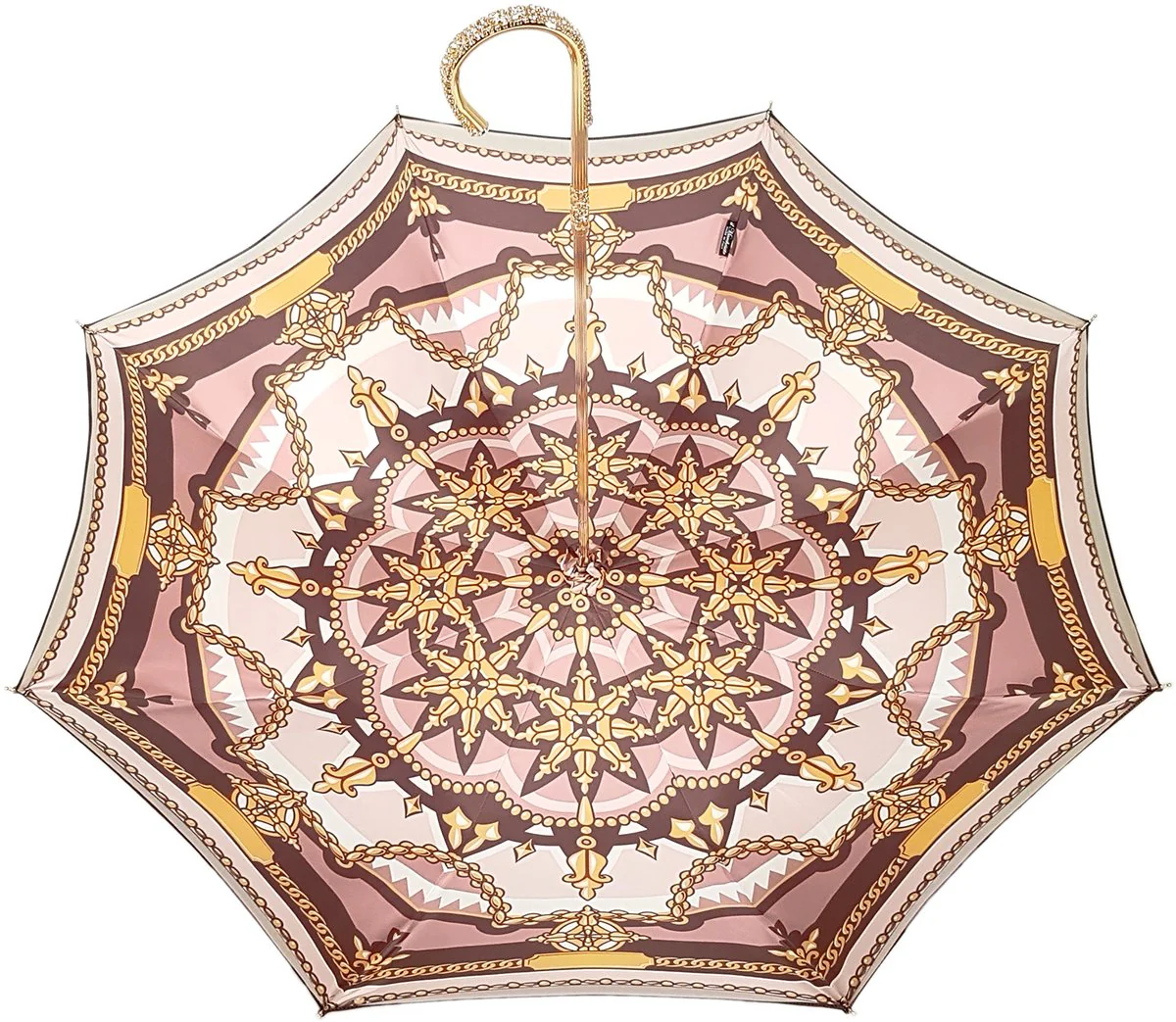 Çadër e lartë për femra, e punuar me dorë, e përfunduar me një pëlhurë poliestër sateni në ngjyrë kafe me hije të imët, e ngjashme me mëndafshin, me një dizajn ekskluziv zinxhir të printuar brenda. Hapja manuale – aksesorë ari 24k. Një dorezë e re e bukur me xhevahire e pasur me kristale Swarovski. (dizenjuar dhe krijuar nga mjeshtrit tanë, data e publikimit të parë 27.06.2018)