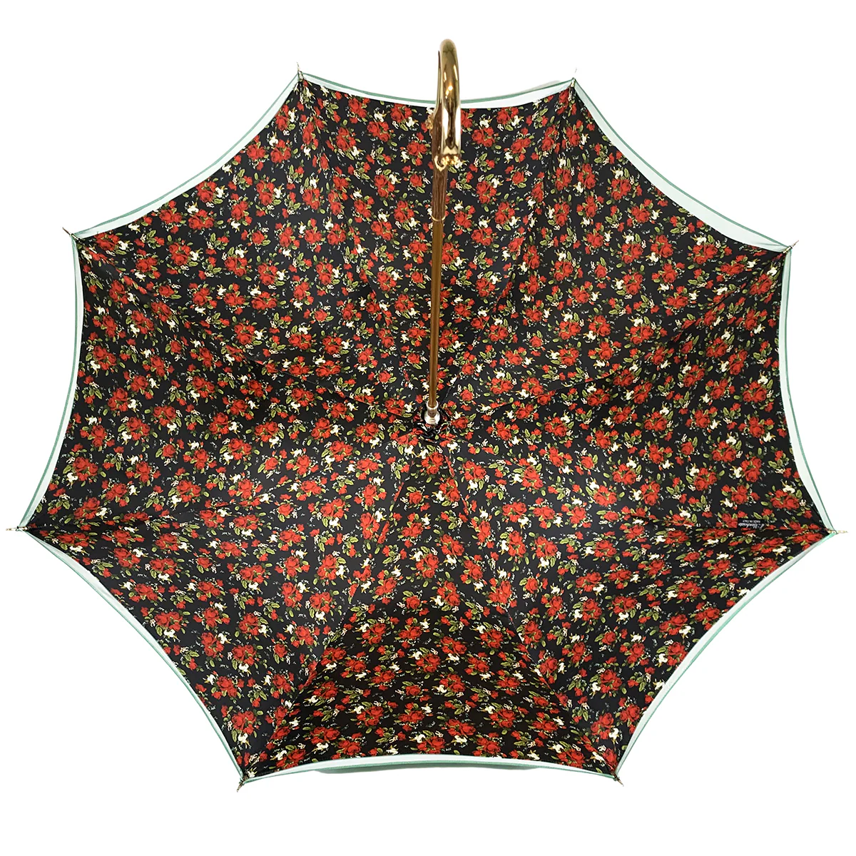 Ombrellë nga koleksioni ynë Premium me model trëndafili të kuq të vegjël brenda, pëlhurë e jashtme jeshile gradient