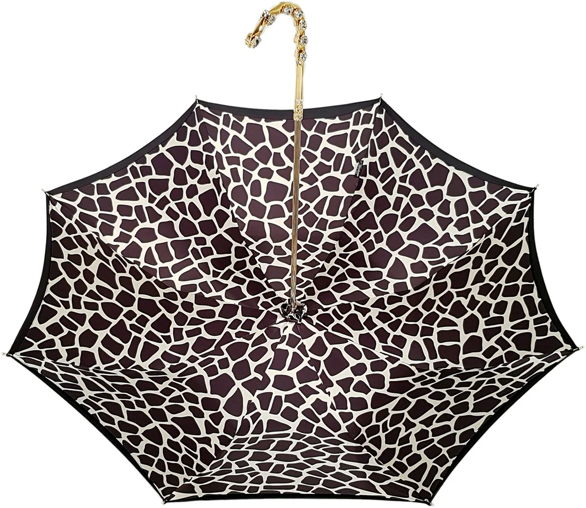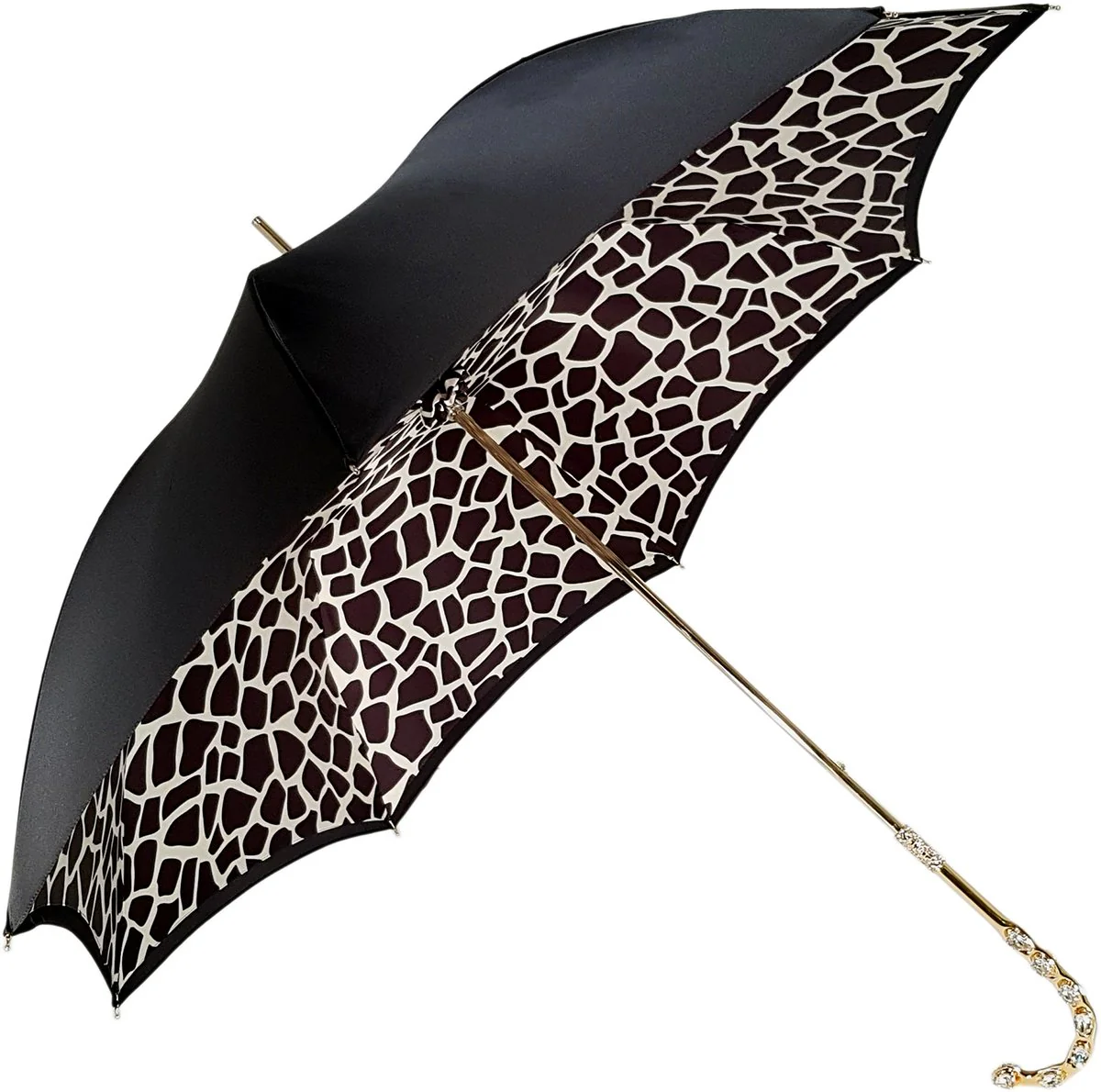 Një ombrellë e shkëlqyer me tendë të dyfishtë e përfunduar me një pëlhurë luksoze prej sateni poliestër të ngjashme me mëndafshin, ajo përmban një mbulesë të jashtme prej pëlhure të zezë me një printim të brendshëm bardh e zi. Dorezë e re e bukur e zbukuruar me 14 gurë të mëdhenj Swarovski, është projektuar dhe krijuar nga mjeshtrit tanë. Dhe ka një kornizë manuale ari me një mbyllje elegante.