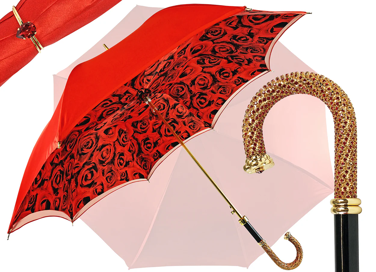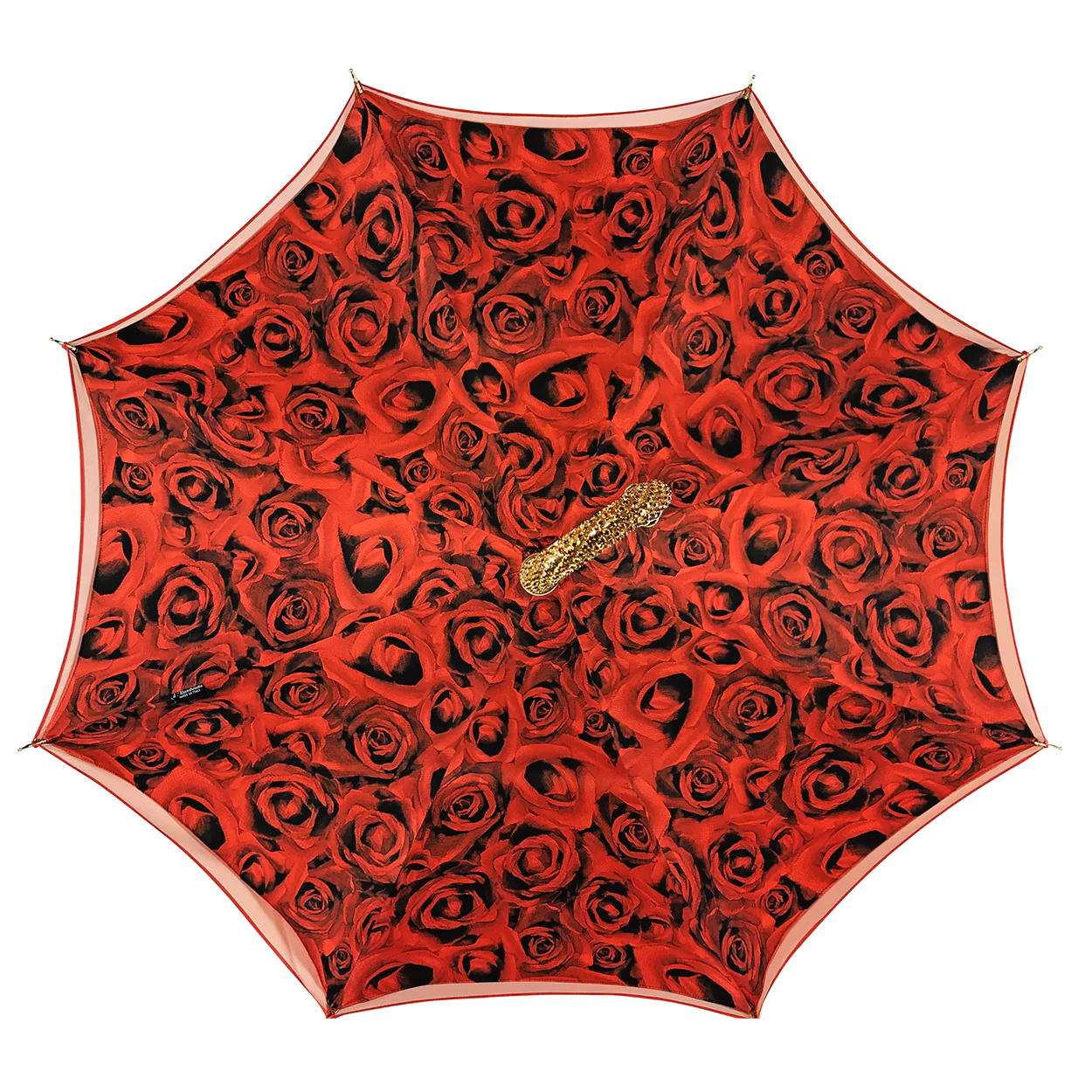 Ombrellë për femra nga koleksioni ynë Premium me Trëndafila të Kuq brenda, Saten Romantik të Kuq jashtë