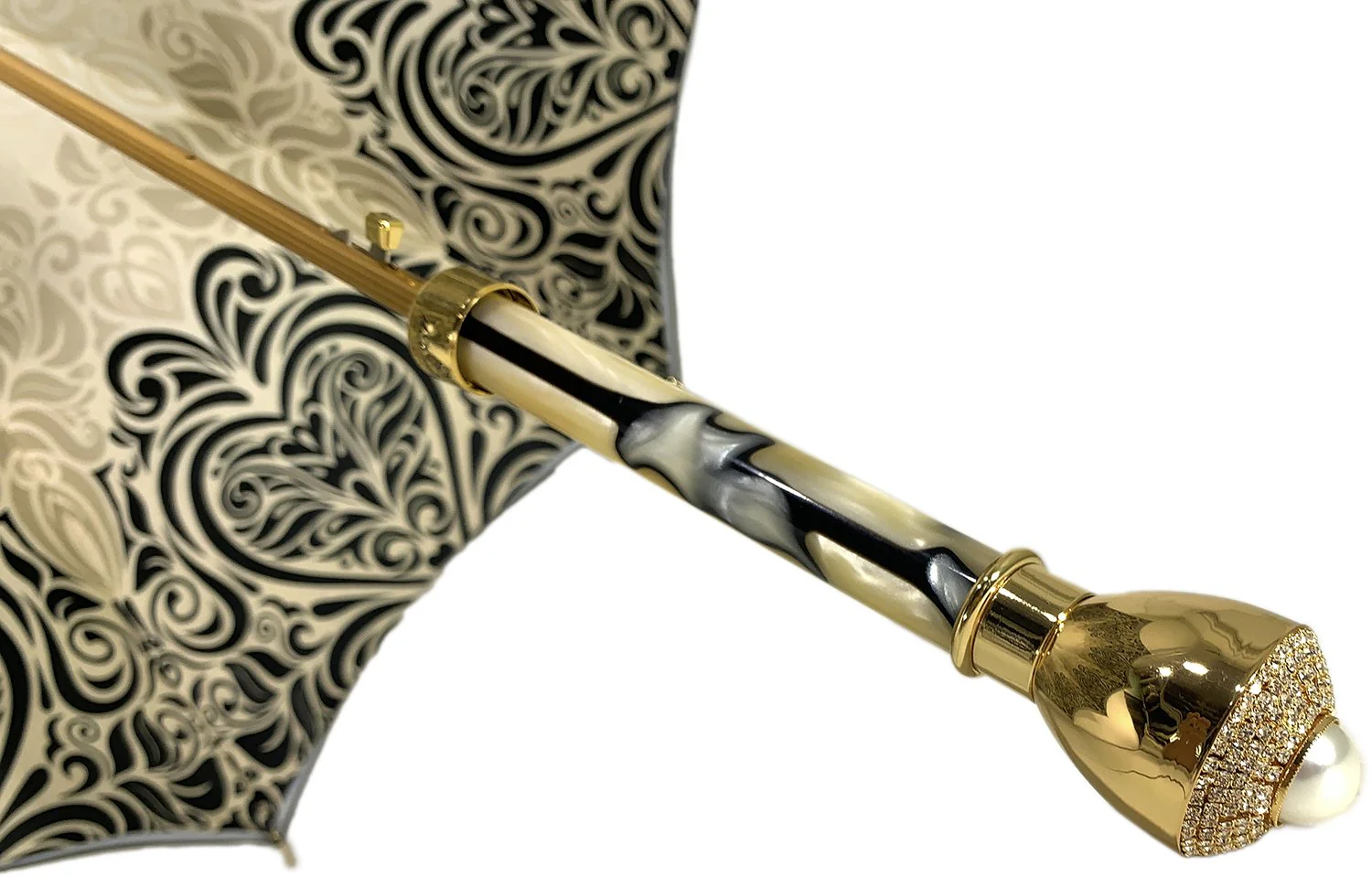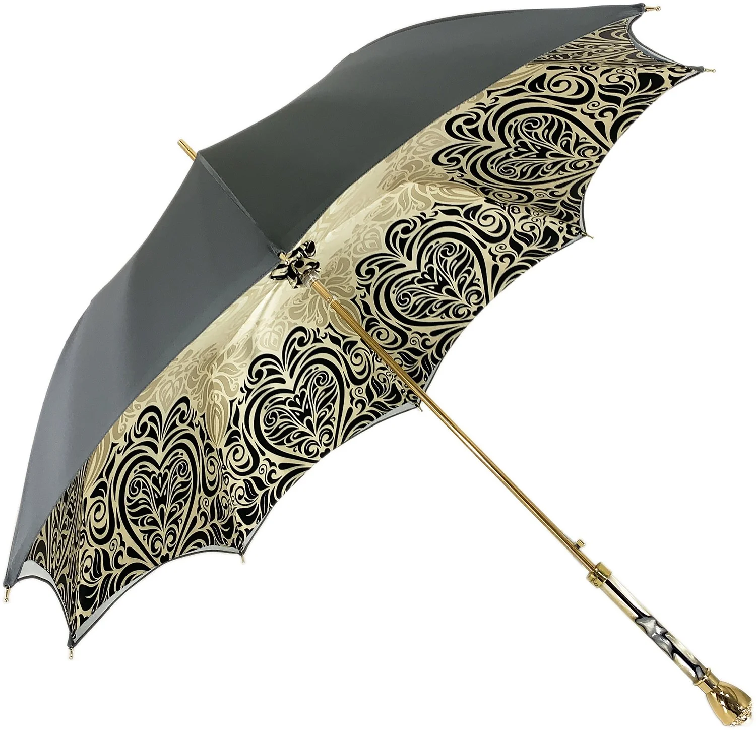 Hapja automatike – Kornizë fleksibël karboni e pathyeshme – aksesorë të veshur me ar 24K. Gjatësia: 93 cm (36,6 in) – Diametri: 102 cm (40,2 in) Mbrojtja maksimale ndaj UV Materiali: Poliestër Saten/Tunxh i punuar me dorë në Itali Kutia e dhuratave e përfshirë Transporti në mbarë botën