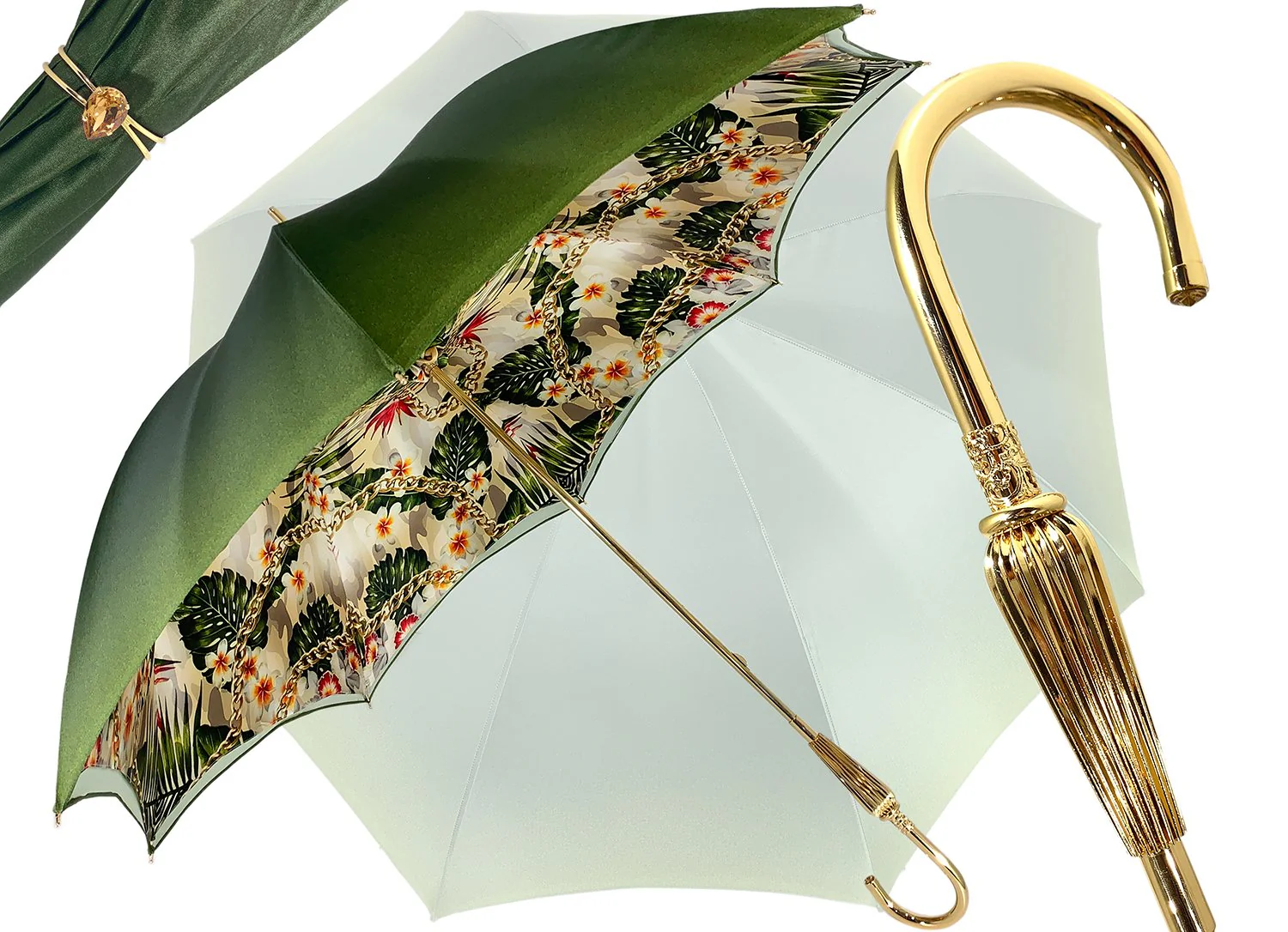 Një çadër e shkëlqyeshme me tendë të dyfishtë e përfunduar me një pëlhurë sateni poliestër të gjelbër me hije të imët, e ngjashme me mëndafshin, ajo përmban një mbulesë të jashtme jeshile me një dizajn të mrekullueshëm të brendshëm të printimit. Kjo çadër ka një dorezë të bukur të stolisur me kristal Swarovski dhe ka një kornizë manuale ari me një mbyllje elegante.