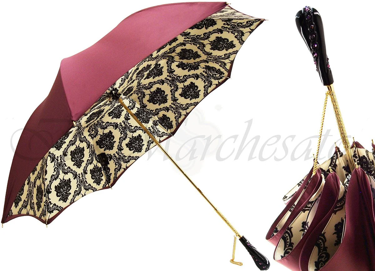 Ombrellë me pëlhurë të dyfishtë për femra luksoze e punuar me dorë, kompozim prej dy pëlhurash me gëzof, bordo jashtë dhe stil barok i dizajnuar brenda.