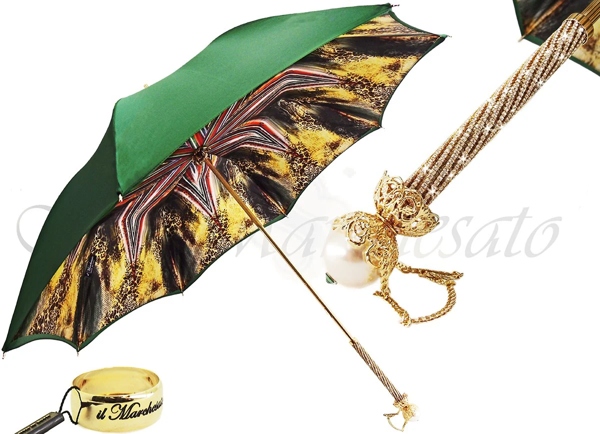 Mbulesa e jashtme prej sateni me ngjyrë jeshile me një pëlhurë të re prej sateni me printime gjeometrike të brendshme.