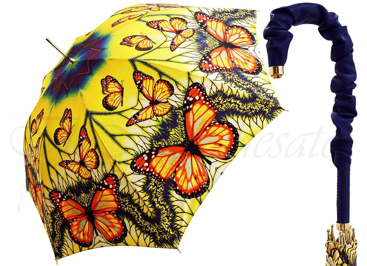 Çadër e bukur fluturash e ndritshme me dizajn ekskluziv në një pëlhurë të vetme, dorezë lëkure blu. Hapja manuale – Aksesorë floriri 24k Gjatësia: 93cm (36,6in) – diametri: 102cm (40,2in) Mbrojtja UV: 50+ UPF E punuar me dorë në itali Kutia e dhuratave Përfshirë transportin mbarëbotëror Materiali: poliestër/tunxh I personalizuar opsionalisht sipas dorezave që keni zgjedhur.