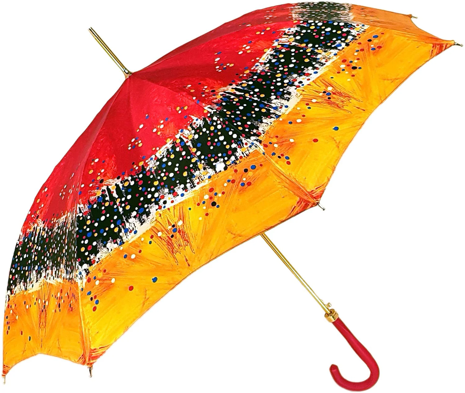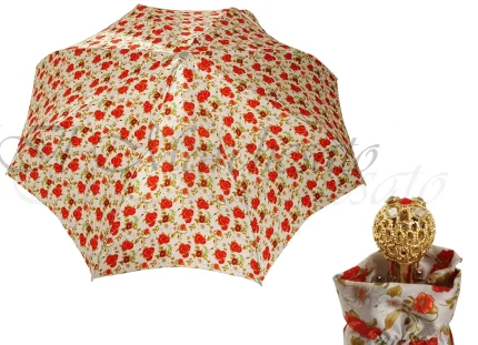 Çadër e bukur e punuar me dorë me bosht ari dhe brinjë tekstil me fije qelqi. Dorezë lëkure e kuqe.