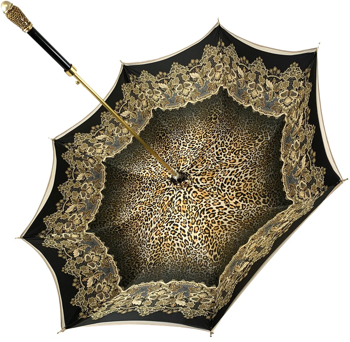 Ombrellë e mrekullueshme me stampa leopardi kremoze prej pëlhure dyshe. Vlen të përmendet doreza e shijshme prej bronzi e veshur me ar 24k, e pasur me diamant të rremë të zi dhe një perlë të bukur. është një ombrellë e lezetshme mode për zonjat. Ide e mrekullueshme dhurate!!