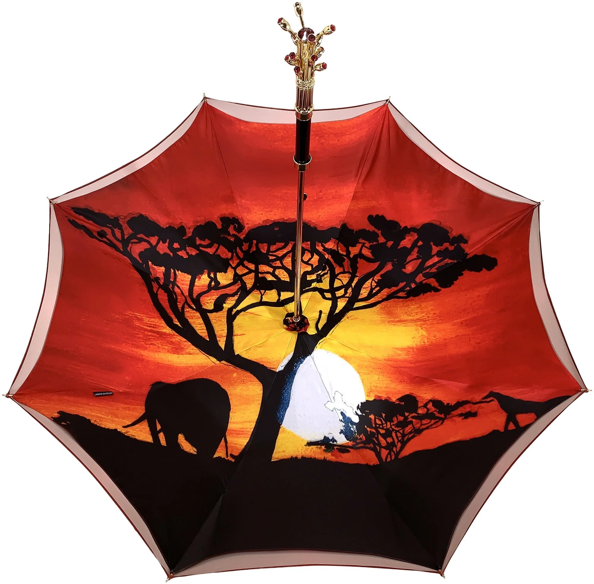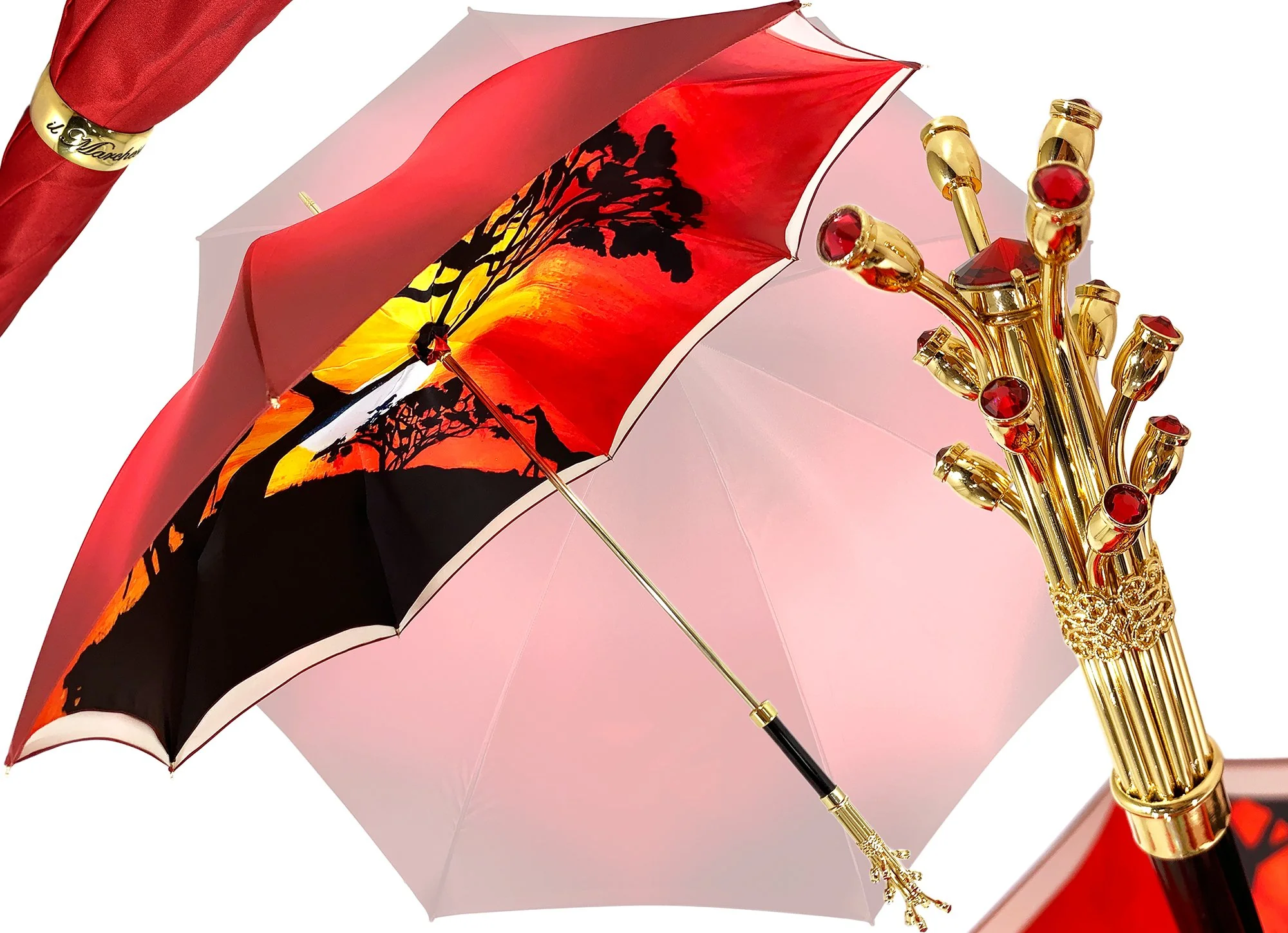 Çadër e mrekullueshme për femra e punuar me dorë, e përfunduar me një pëlhurë sateni poliestër me hije të hollë të kuqe, e ngjashme me mëndafshin, me një dizajn ekskluziv savanë të printuar brenda.