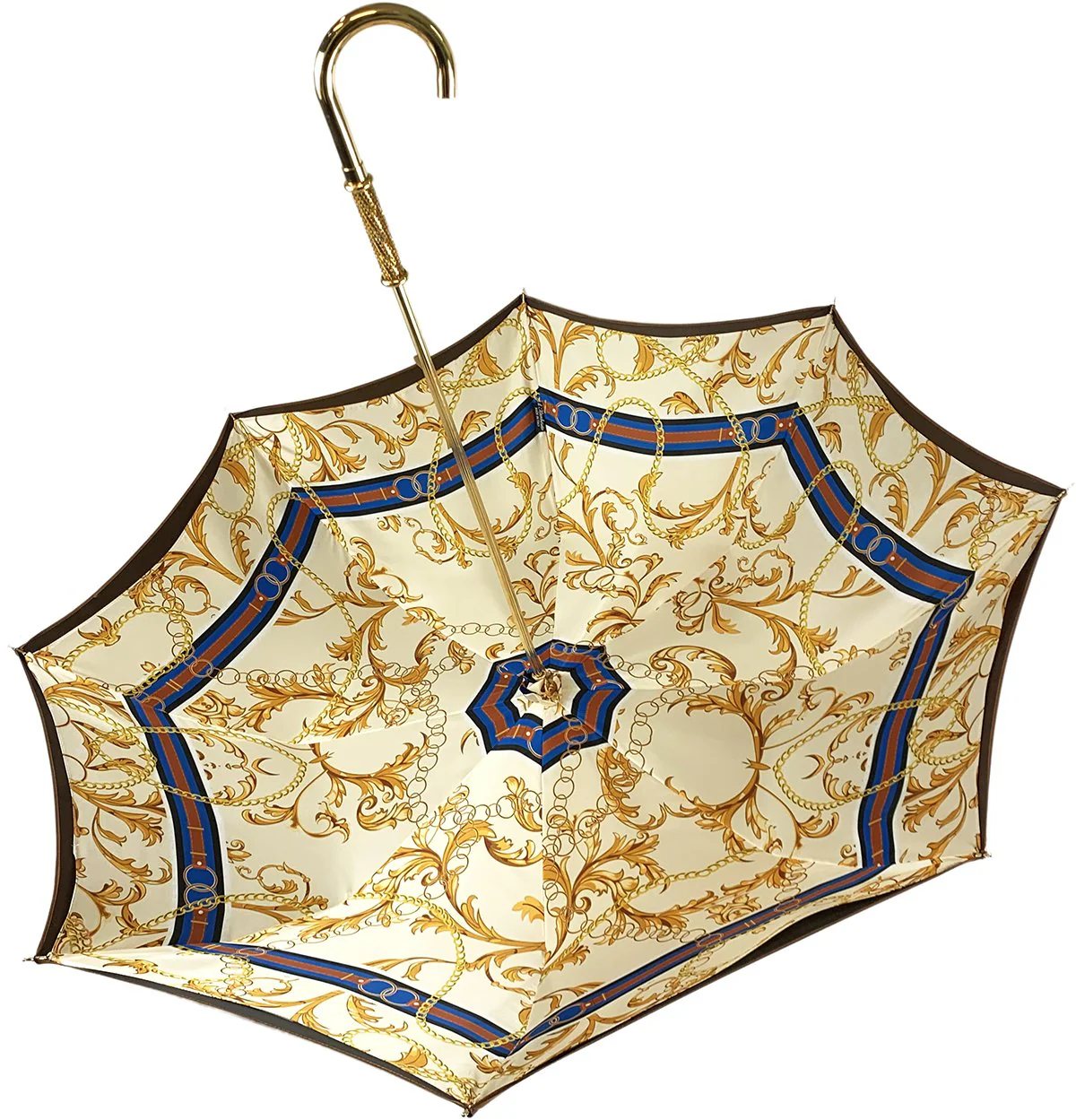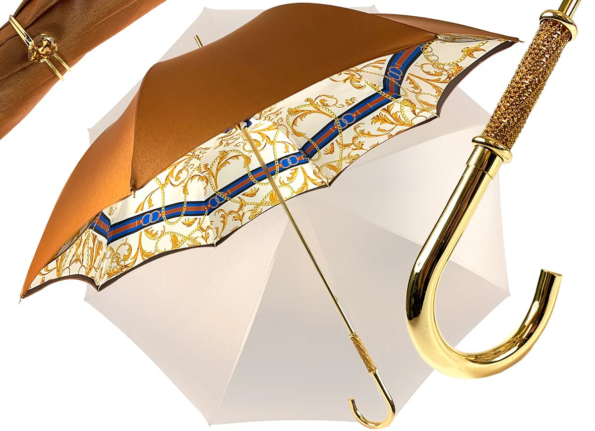 Ombrellë elegante dhe elegante prej pëlhure e punuar me dorë për femra në një tendë bronzi, dizajn i bukur zinxhir i printuar në një sfond të lehtë kremi brenda. Ombrella është e shtrirë duke përdorur një unazë të bukur ari që shmang nevojën për një brez kravata. Ide e mrekullueshme dhurate!!