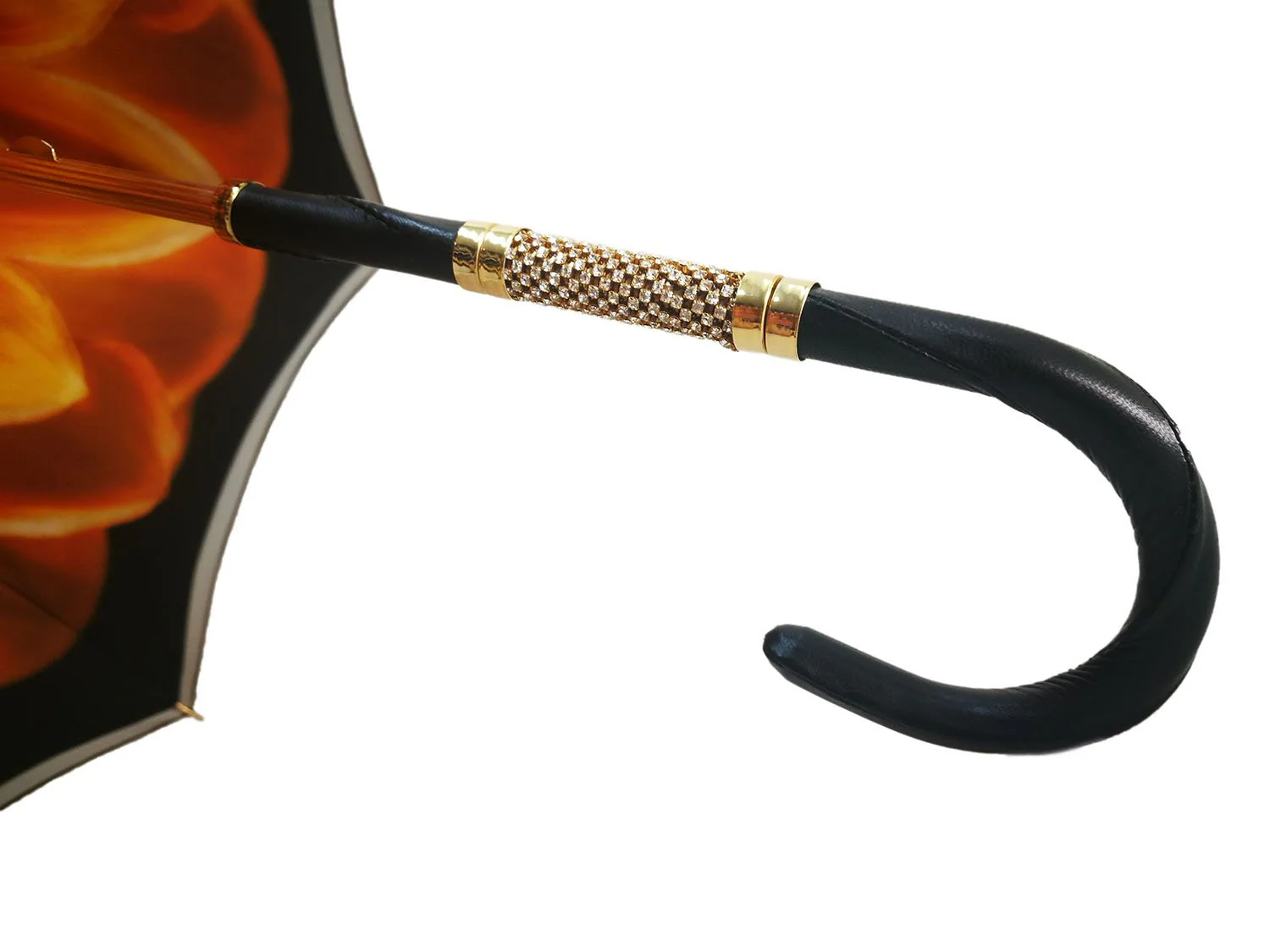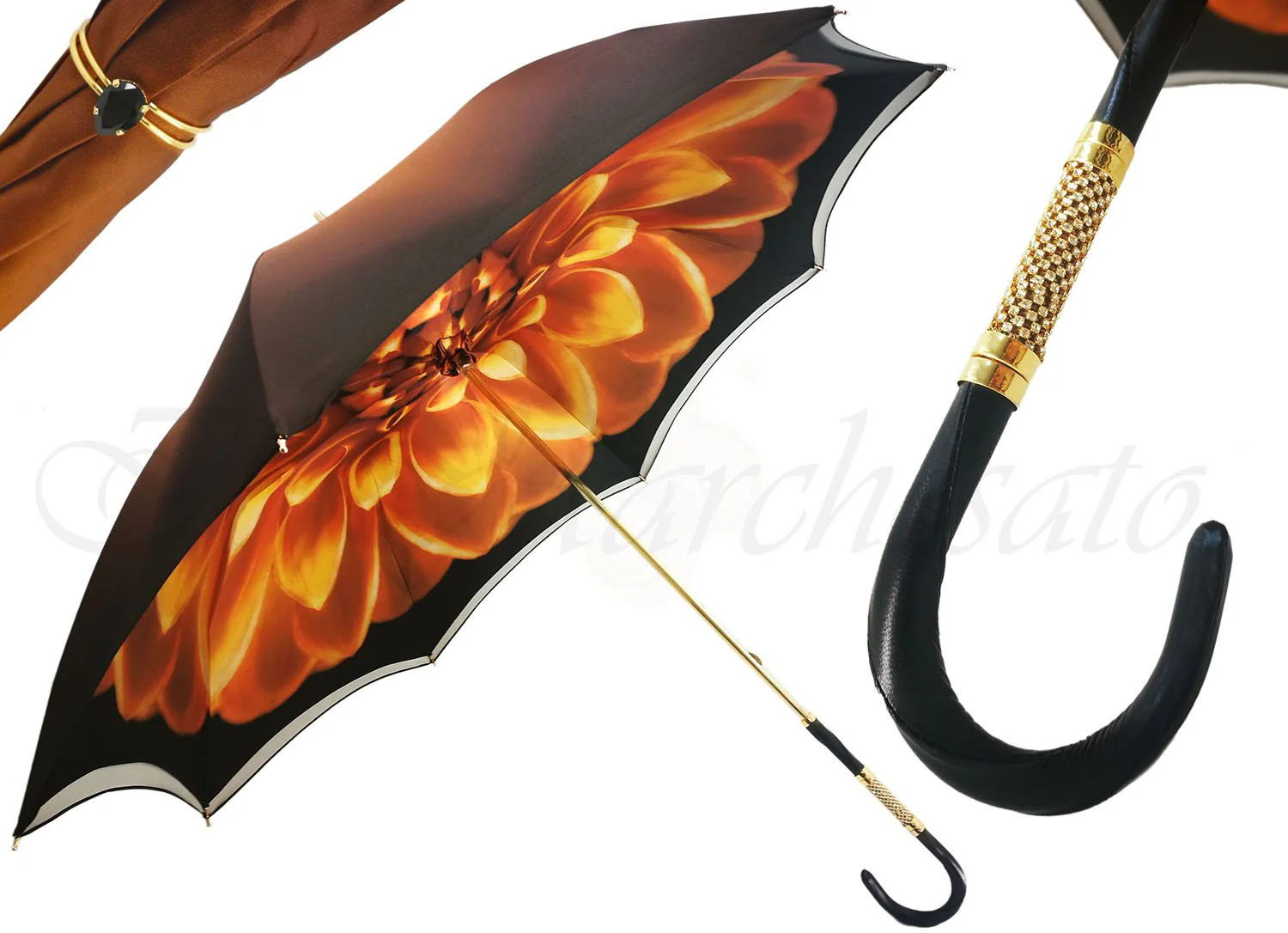 Çadër e mrekullueshme për femra e punuar me dorë, e përfunduar me një pëlhurë saten poliestër kafe me gradient të hollë, me një dizajn ekskluziv GERBERA të printuar brenda .