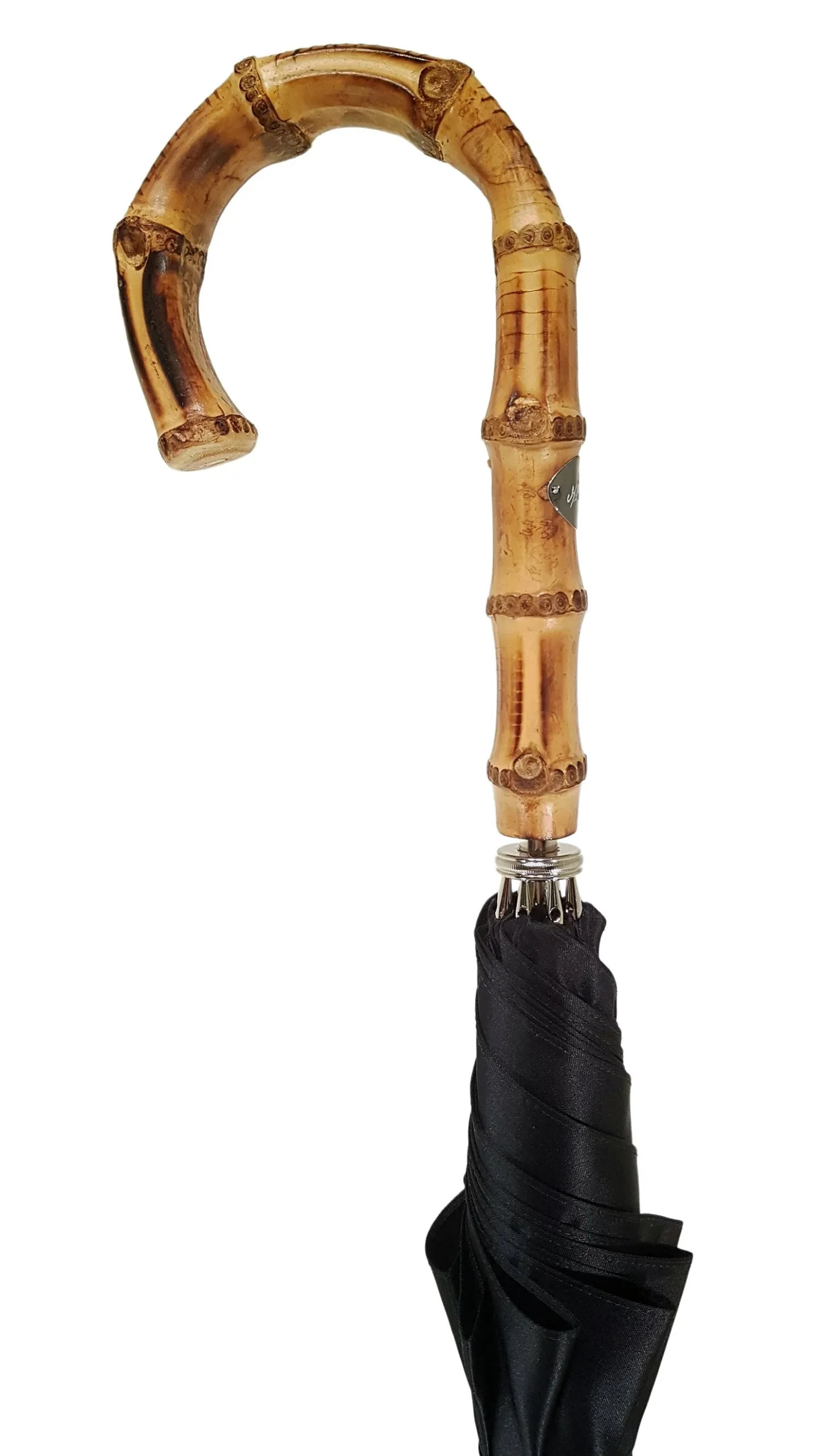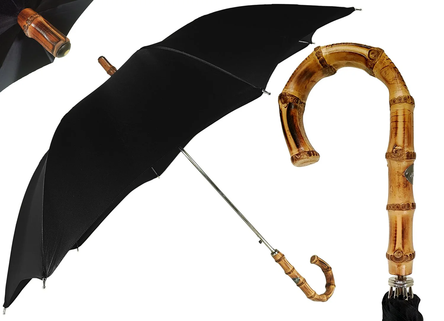 Kjo çadër elegante dhe klasike e zezë për zotërinj ka një tendë të bërë nga poliesteri më i mirë italian. Ai gjithashtu përmban një kornizë metalike me hapje manuale argjendi, dhe është në krye me një dorezë dhe majë të punuar bukur nga whanghee (Bambu).