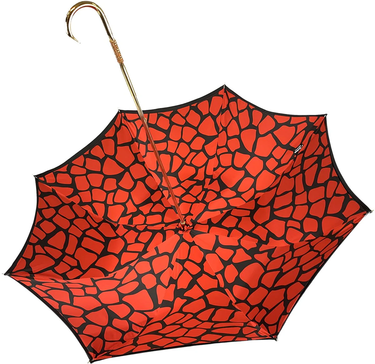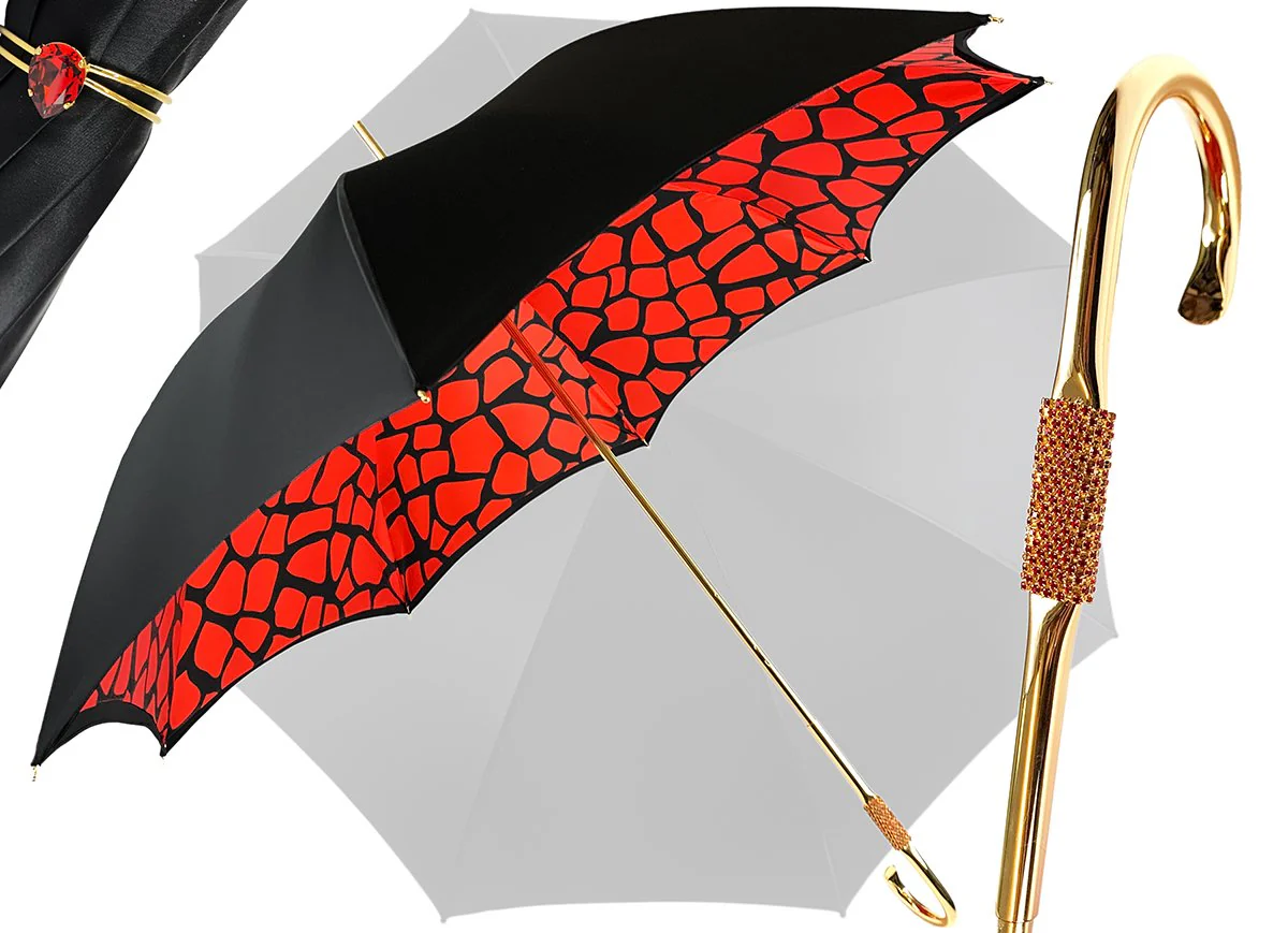 Çadër e mrekullueshme për femra e punuar me dorë, e përfunduar në ngjyrë të zezë mbi një pëlhurë poliestër saten, me një model ekskluziv të gjirafës së kuqe të printuar brenda. Vini re dorezën e rafinuar të pasur me diamant të kuq.