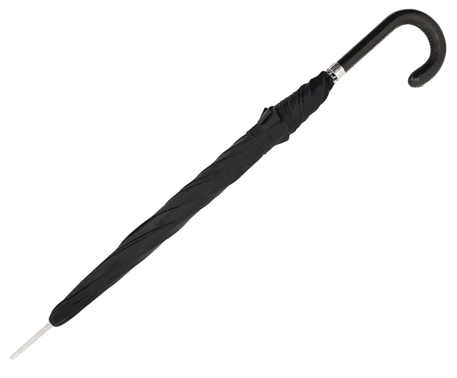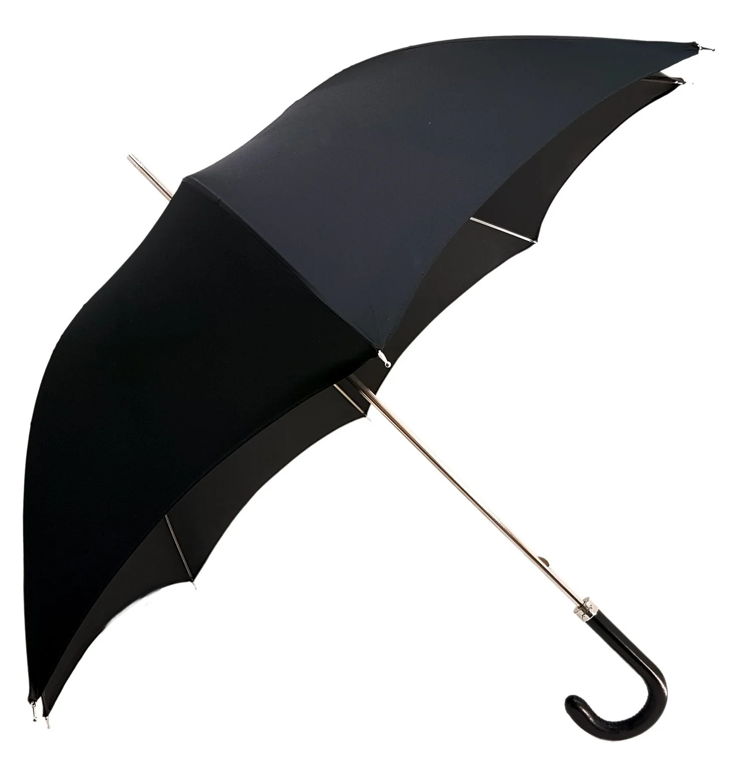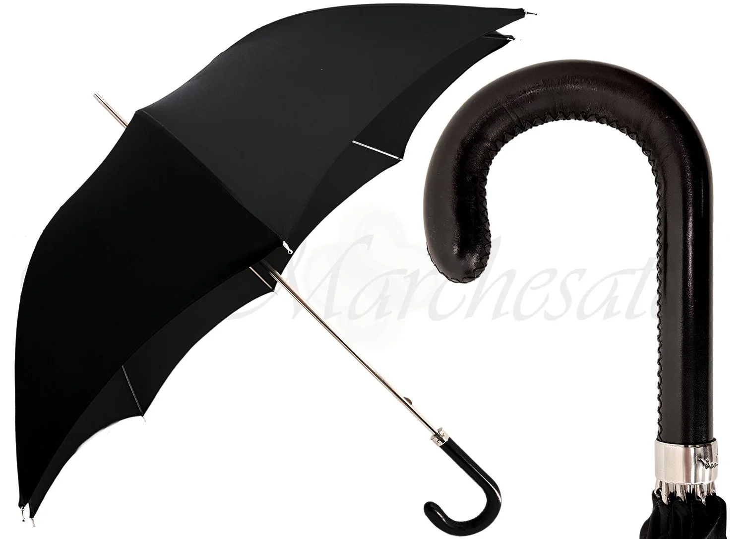 Kjo çadër elegante dhe klasike e zezë për zotërinj ka një tendë të bërë nga poliesteri më i mirë italian. Ai gjithashtu përmban një kornizë metalike me hapje manuale argjendi dhe është e mbivendosur nga një dorezë lëkure e punuar bukur.
