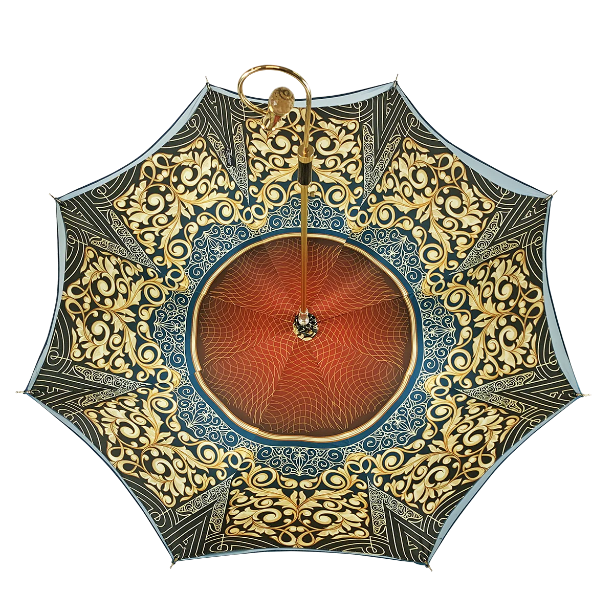Çadër nga koleksioni ynë Premium me model dekorativ brenda, pëlhurë e jashtme me gradient blu benzinë