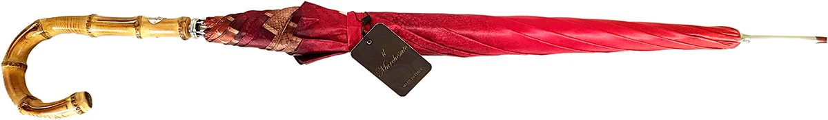 Kjo ombrellë elegante dhe klasike e zotërinjve ka një tendë të bërë nga poliesteri më i mirë italian. Ai gjithashtu përmban një kornizë çeliku me hapje automatike të argjendtë dhe është e mbivendosur nga një dorezë e punuar bukur Whangee (bambu).