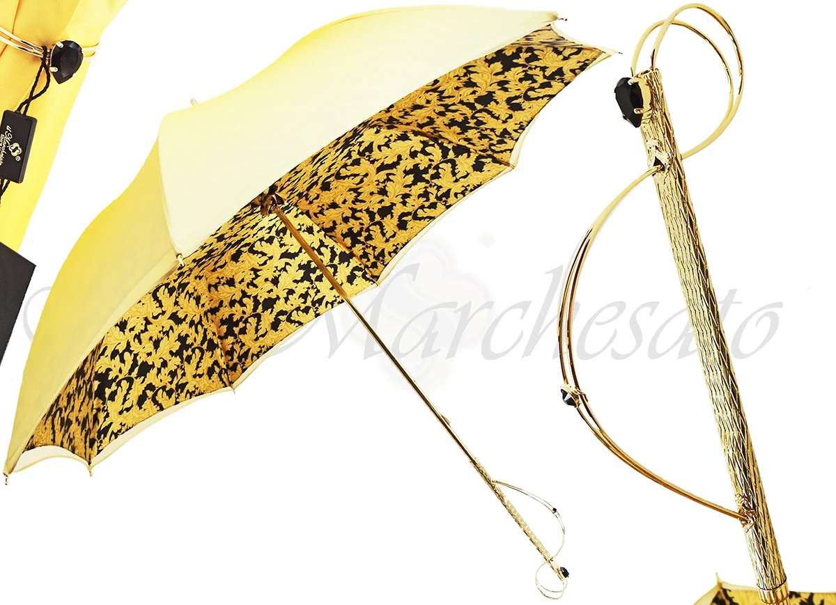 Një ombrellë e bukur e dyfishtë me tendë e përfunduar me një pëlhurë luksoze prej sateni poliestër , ajo përmban një mbulesë të jashtme të verdhë ari me një printim masiv me lule mbi një sfond të çelur të çelur. Kjo çadër ka një dorezë ari të pastër cilësore dhe ka një kornizë manuale ari me një mbyllje elegante fiksuese. Dorezë origjinale e zbukuruar me gurë Swarovski.