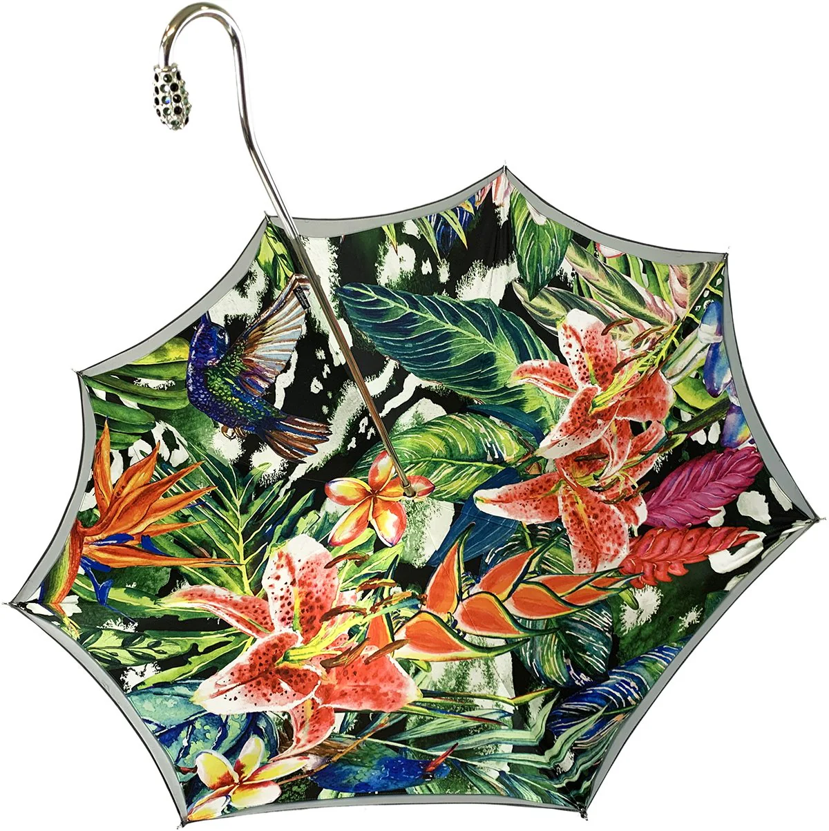 Një çadër e guximshme dhe elegante e punuar me dorë, e punuar me tendë të jashtme me ngjyrë gri gradient dhe printime të brendshme me lule shumëngjyrëshe dhe bosht metalik të praruar. Vlen të përmendet doreza e shijshme e veshur me argjend, e zbukuruar me strass Swarovski. Çadra është e shtrirë duke përdorur një unazë të bukur që shmang nevojën për një brez kravata. Ide e mrekullueshme dhurate!!
