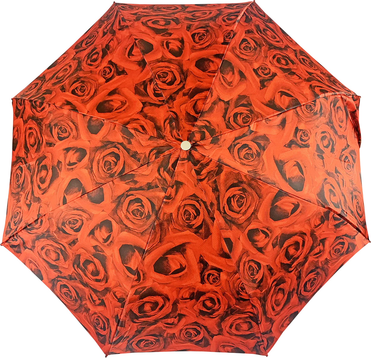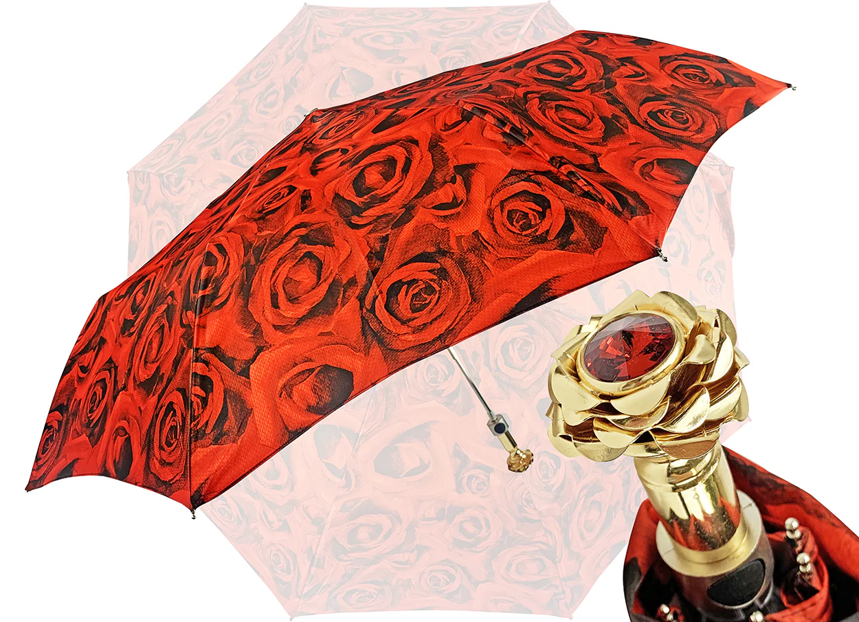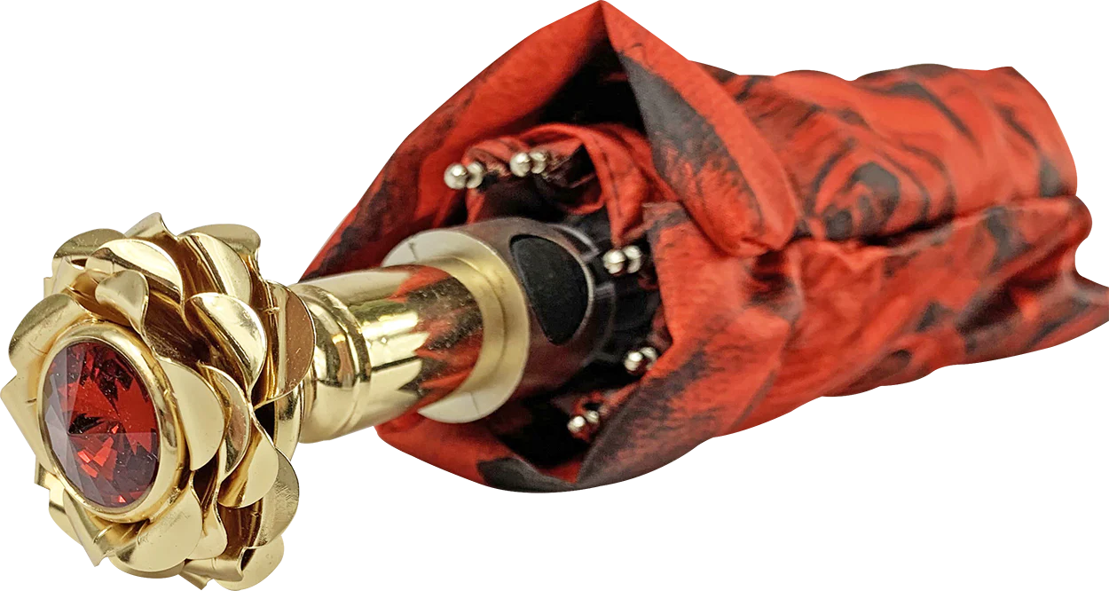 Çadër e vogël e palosshme për femra e punuar me dorë, e zbukuruar me dorezë trëndafili 24k të veshur me ar dhe kristal të madh të kuq.