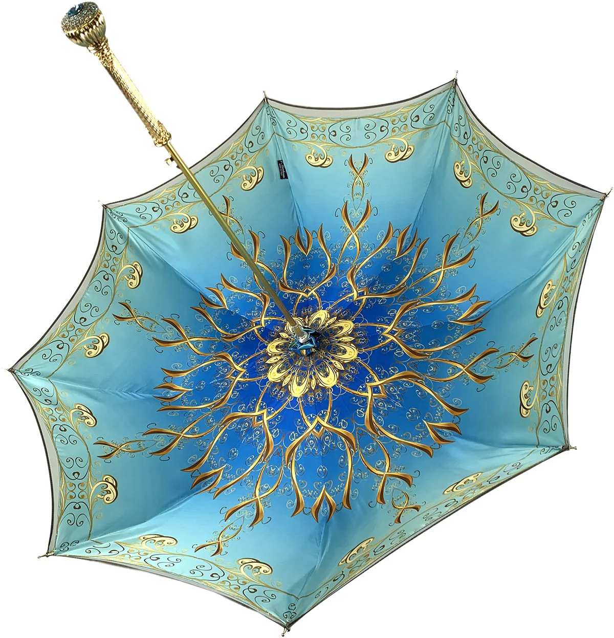 Çadra elegante dhe stilizuar me dorë të bërë me dorë për gra, me një kanopi në gradient ari, një model të këndshëm brenda dhe një shalë të arit metalik. Vlen të theksohet dora e shijshme e arit të platuar, e pasuruar me rhinestones akvamarin. Çadra është e mbyllur me një unazë të bukur ari, e cila shmang nevojën për një grup lidhës. Ide e shkëlqyer për dhuratë!!