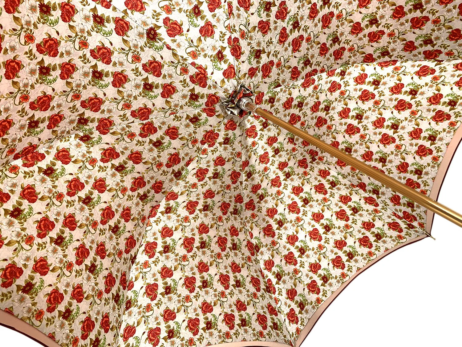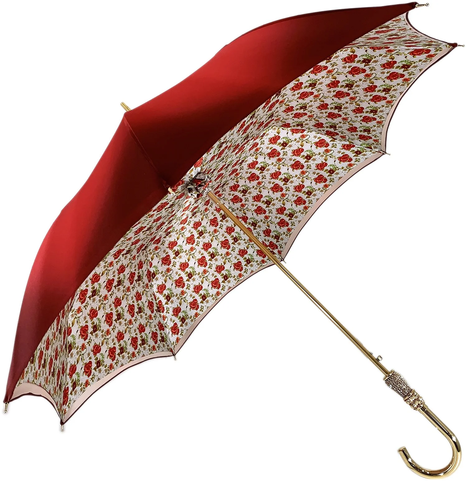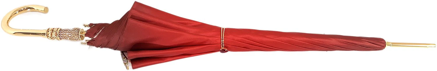 Çadra për Gra e Bërë me Dorë në Ngjyrë të Kuqe me Trëndafila të Vegjël në Brendësi me Print Gri dhe Dorezë Luksuze të Bërë me Dorë, e Artë me 24K dhe Kristale Swarovski.