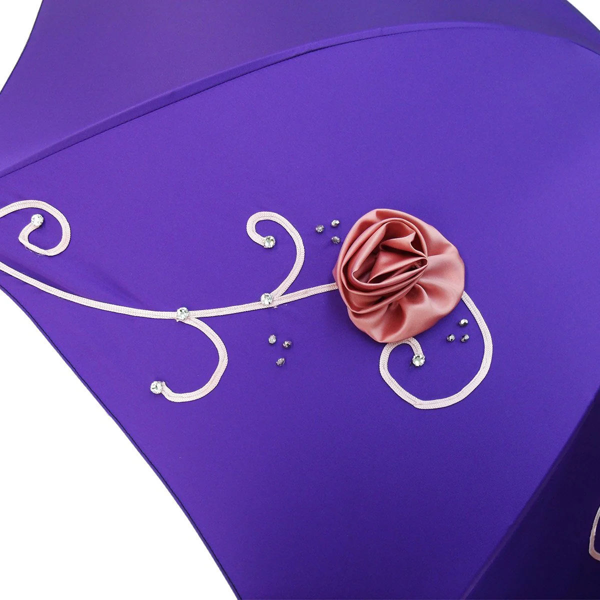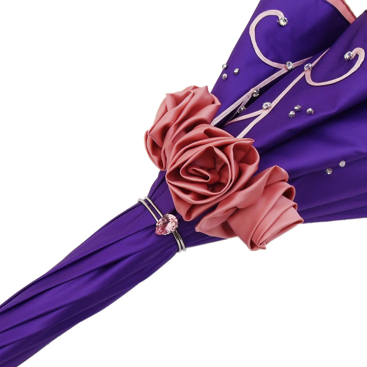 Këndi i jashtëm në ngjyrë purpur është i zbukuruar me trëndafila dhe perla të vendosura me dorë. Kanapeja e brendshme në ngjyrë rozë është e përfunduar me katër trëndafila.