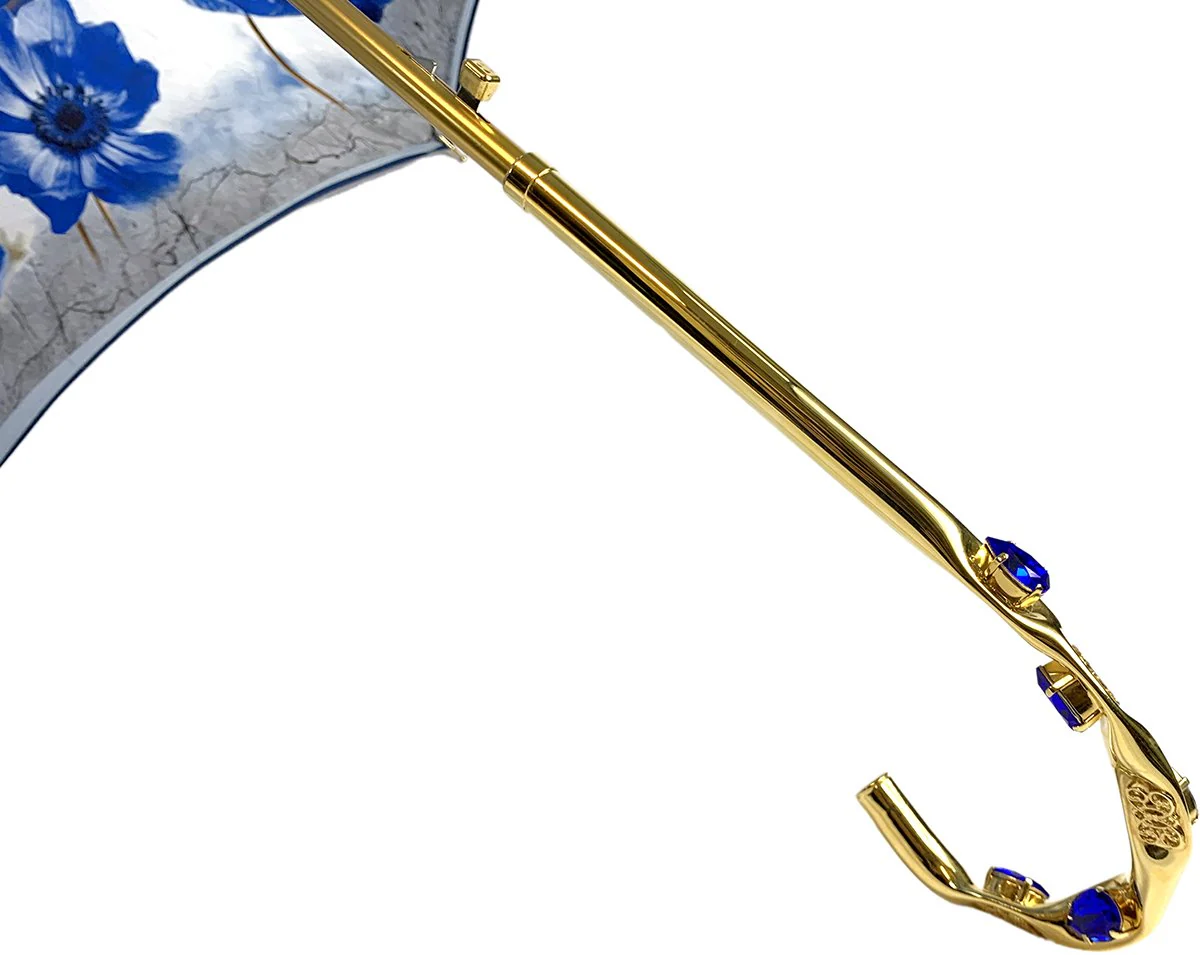 Çadra e Bërë me Dorë për Gra me Dy Pjesë Të Materialit, e Stilizuar dhe Chic, me Çadra në Gradiente Blu, me Një Motif të Bukur Lulesh nga Brenda dhe Shufër Metalike të Artë.