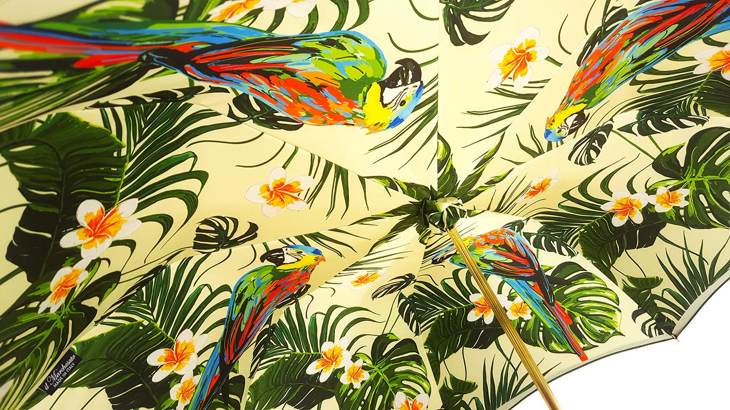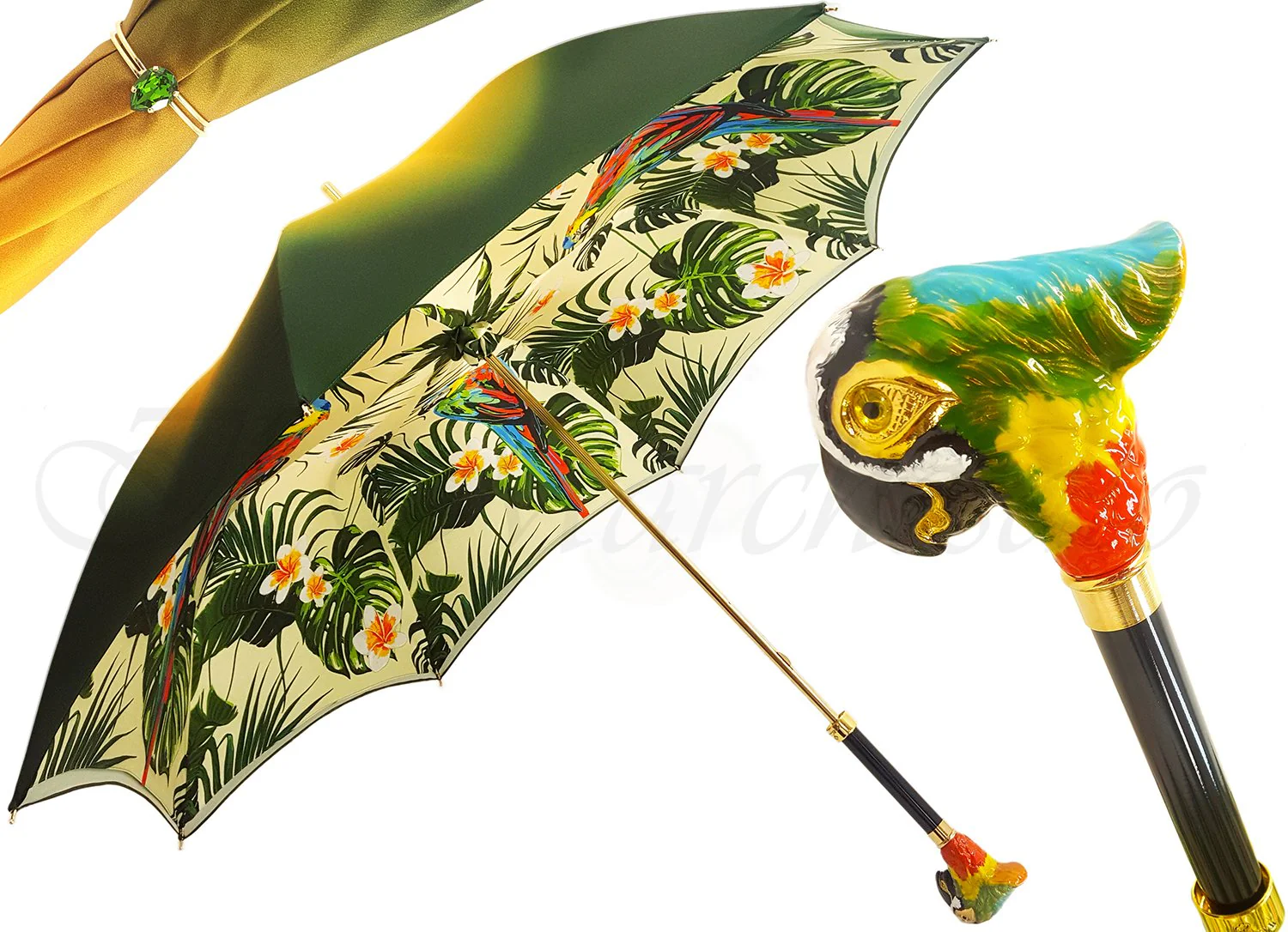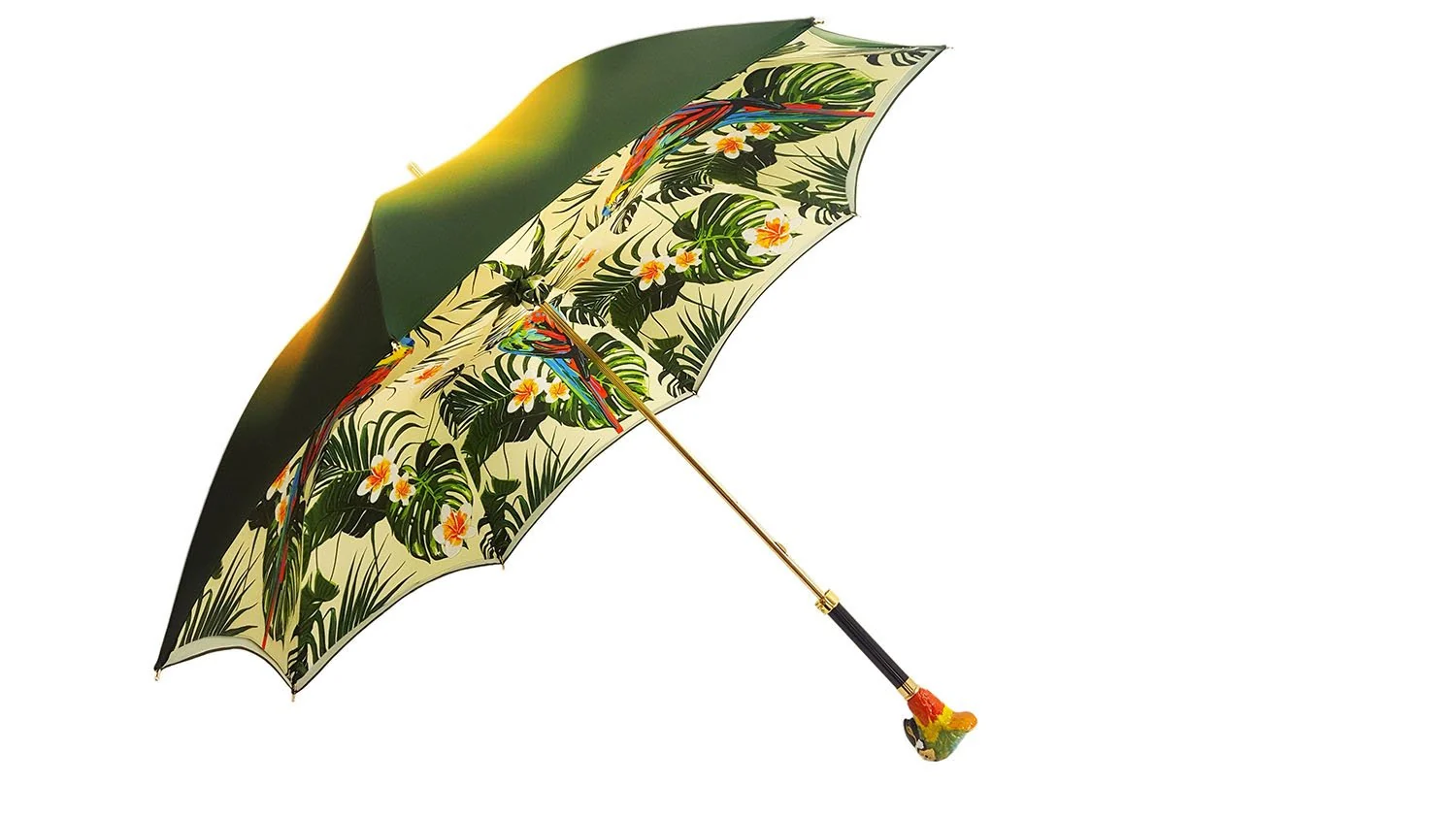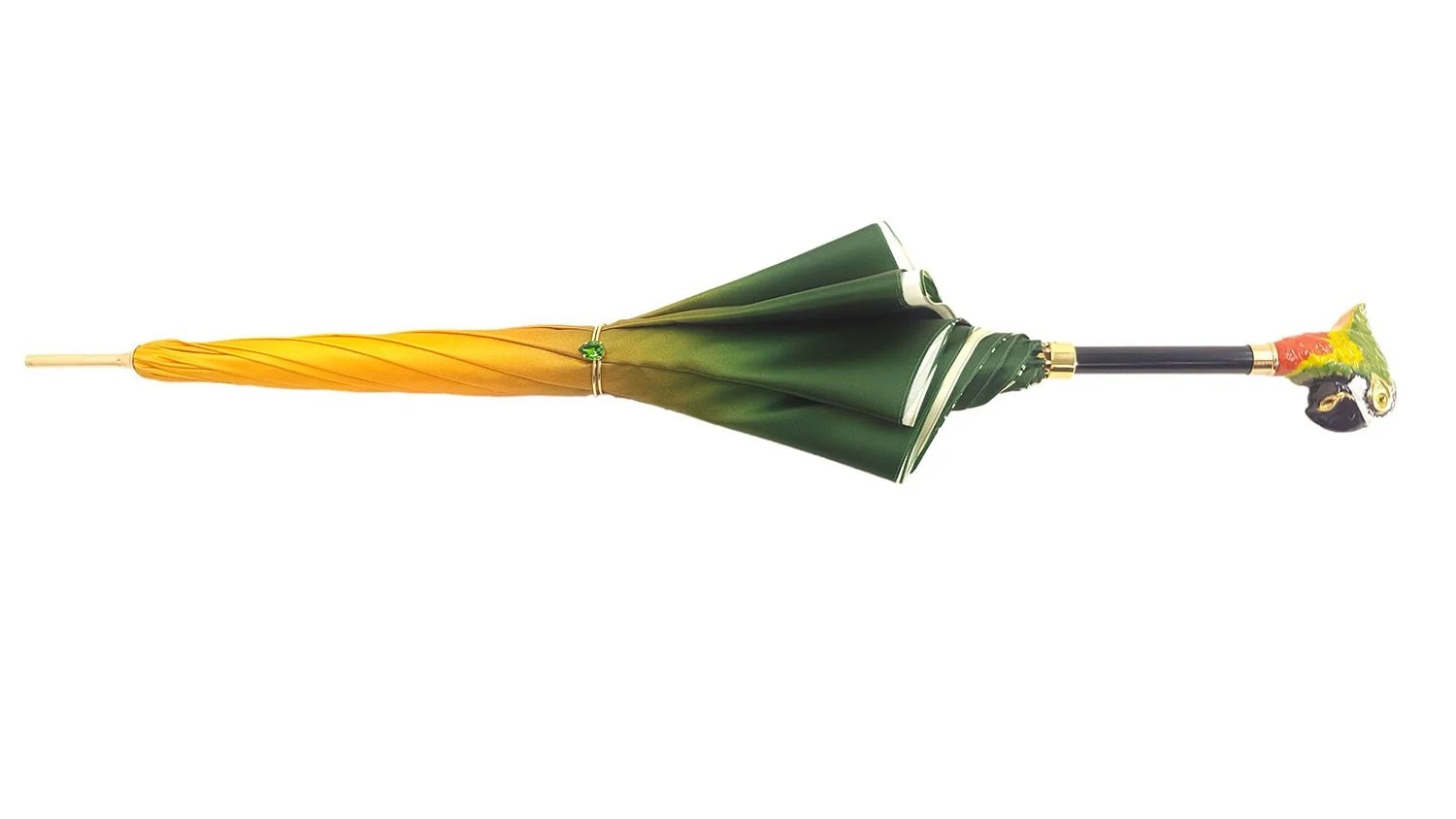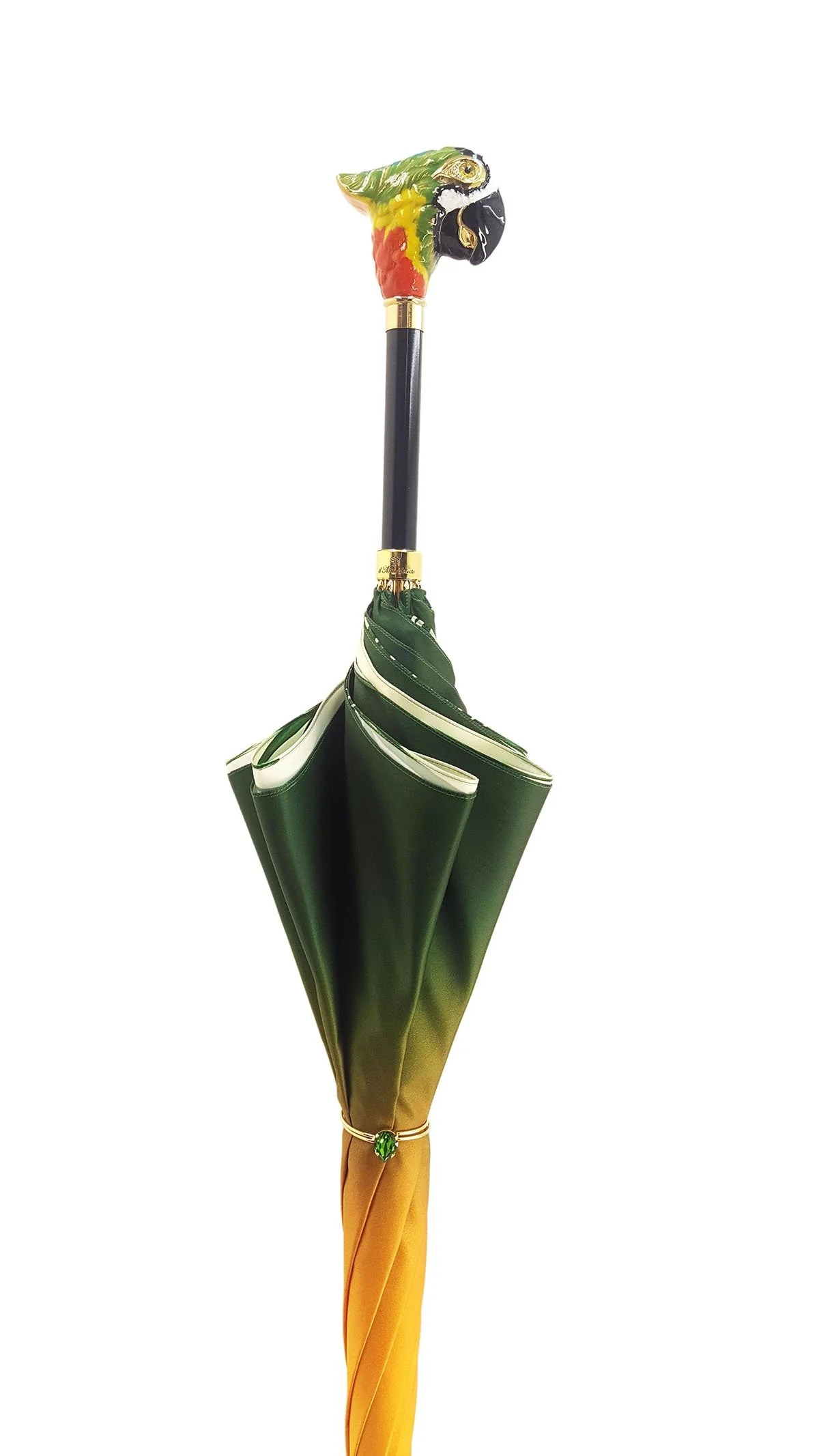Çadër e mrekullueshme për gra, punuar me dorë, e përfunduar me një pëlhurë të hollë saten poliester në gradient të gjelbër/jeshil, me një dizajn ekskluziv PAPAGALLI të printuar nga brenda.