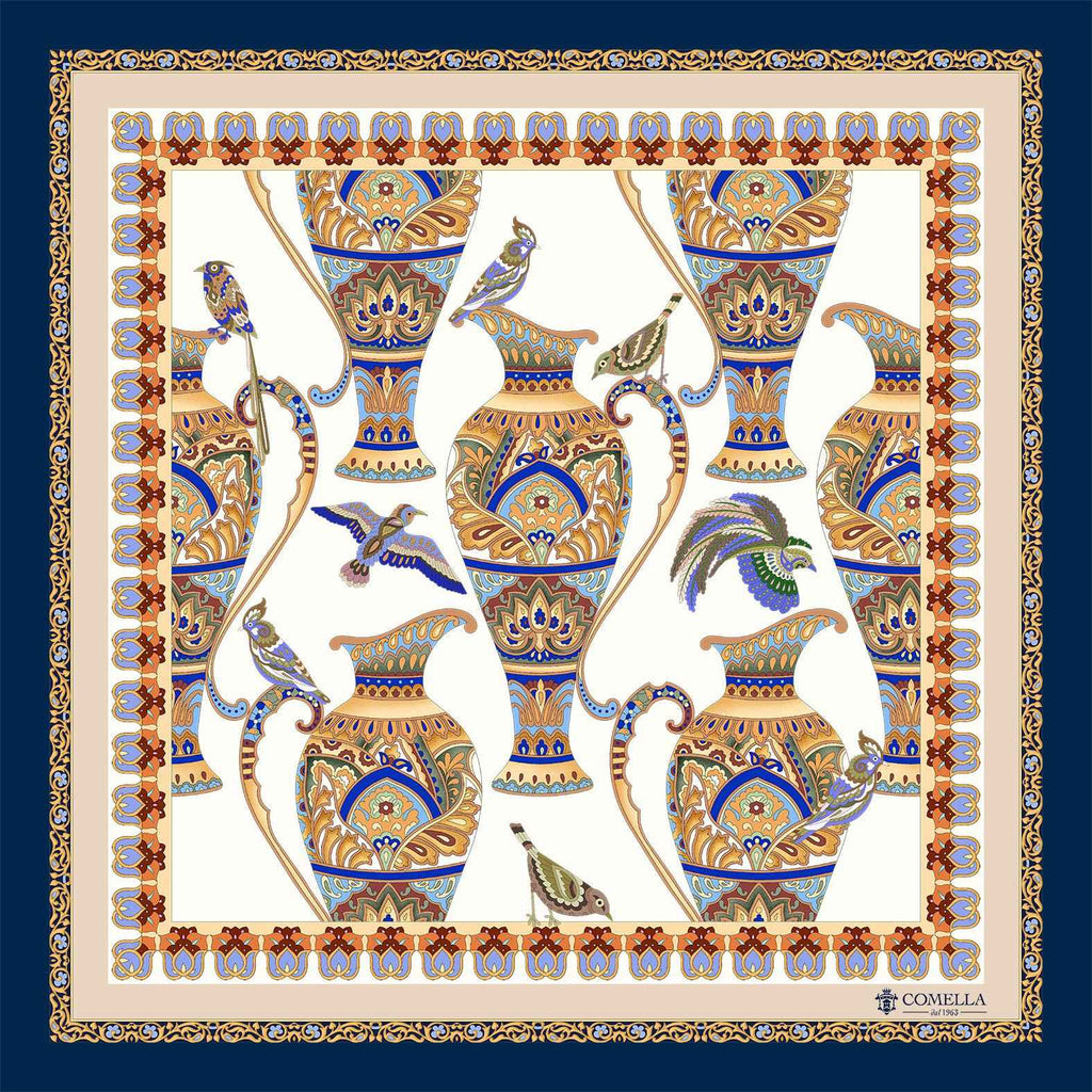 Kjo seri shamish prej mëndafshi natyral 90x90 cm e transporton shikimin në Egjiptin e lashtë, ku vazot e rafinuara dhe zogjtë elegantë me pendë ndërthuren në një rrëfim vizual magjepsës. Modelet janë të frymëzuara nga motive klasike qeramike që paraqesin zogj dhe vazo të stilizuara.
