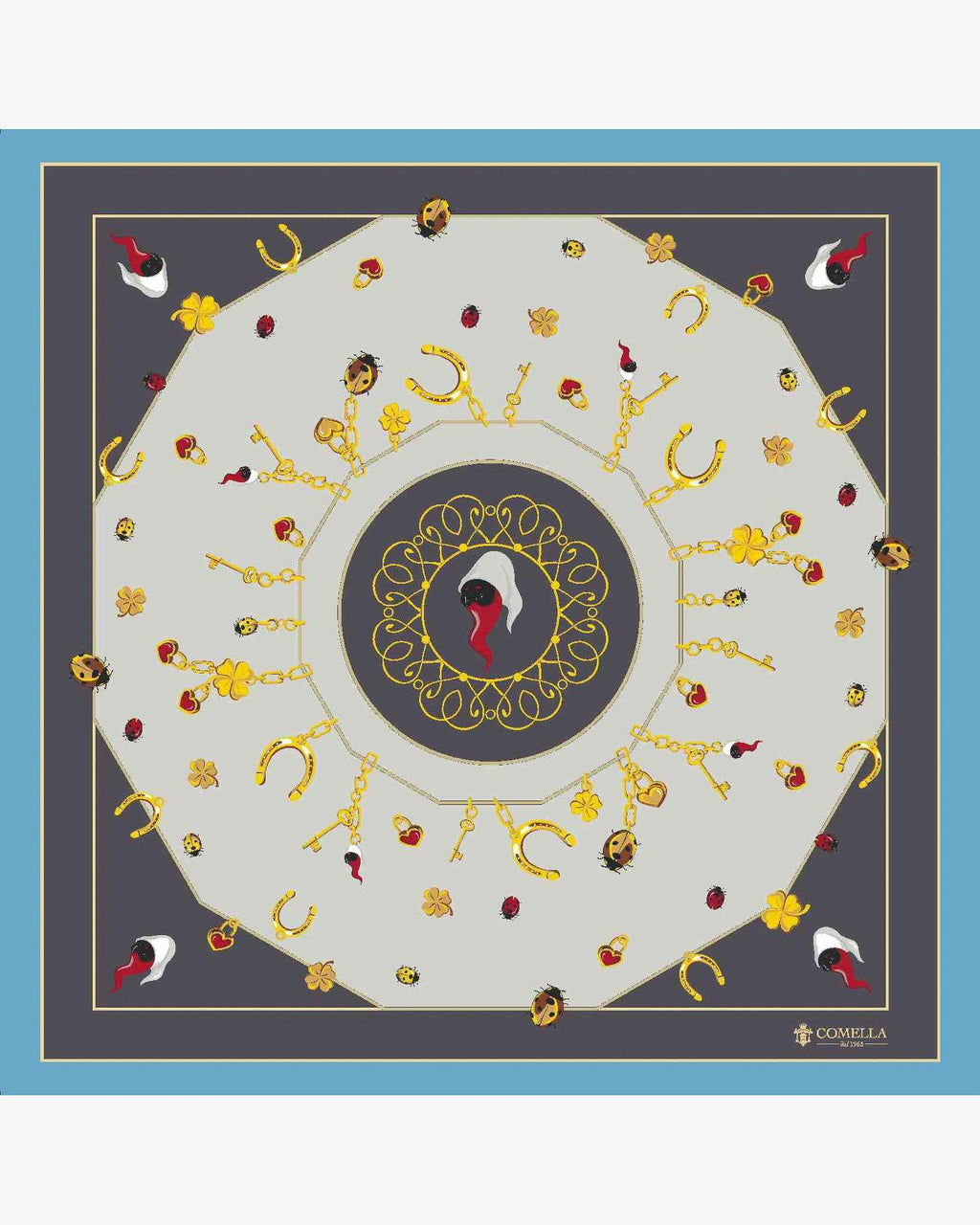 Një simbol i traditës dhe mbrojtjes është i ndërthurur në këtë shall Pulcicorno, një bashkim origjinal i maskës klasike Pulcinella dhe bririt të kuq, amuletit më të vjetër napolitan kundër syrit të keq. I punuar nga mëndafshi i pastër dhe i përfunduar me një skaj të mbështjellë me dorë, ky shall 90 x 90 cm është shumë më tepër sesa një aksesor: është një talisman stili, duke kombinuar elegancën artizanale me forcën e një legjende të lashtë. Një aksesor unik dhe dallues, i projektuar për ata që dëshirojnë të veshin në mënyrë diskrete një pjesë autentike të kulturës napolitane.