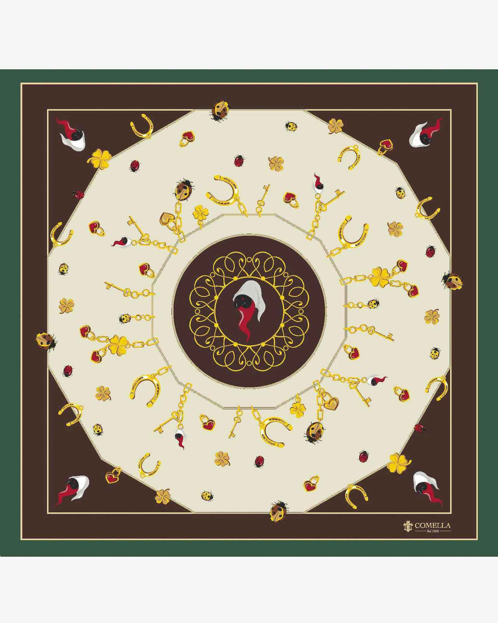 Një simbol i traditës dhe mbrojtjes është i ndërthurur në këtë shall Pulcicorno, një bashkim origjinal i maskës klasike Pulcinella dhe bririt të kuq, amuletit më të vjetër napolitan kundër syrit të keq. I punuar nga mëndafshi i pastër dhe i përfunduar me një skaj të mbështjellë me dorë, ky shall 90 x 90 cm është shumë më tepër sesa një aksesor: është një talisman elegant, që kombinon elegancën artizanale me forcën e një legjende të lashtë. Një aksesor unik dhe dallues, i projektuar për ata që duan të veshin në mënyrë diskrete një pjesë autentike të kulturës napolitane.