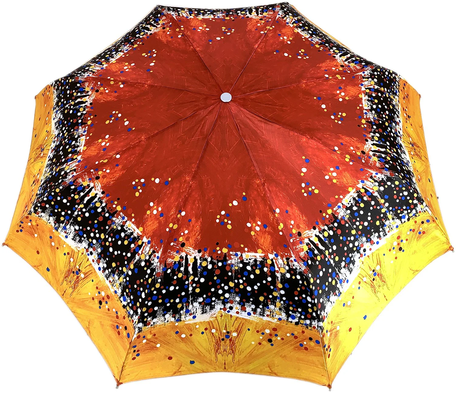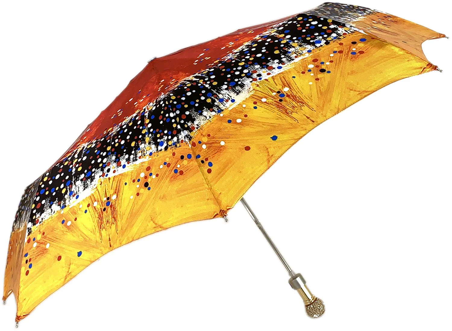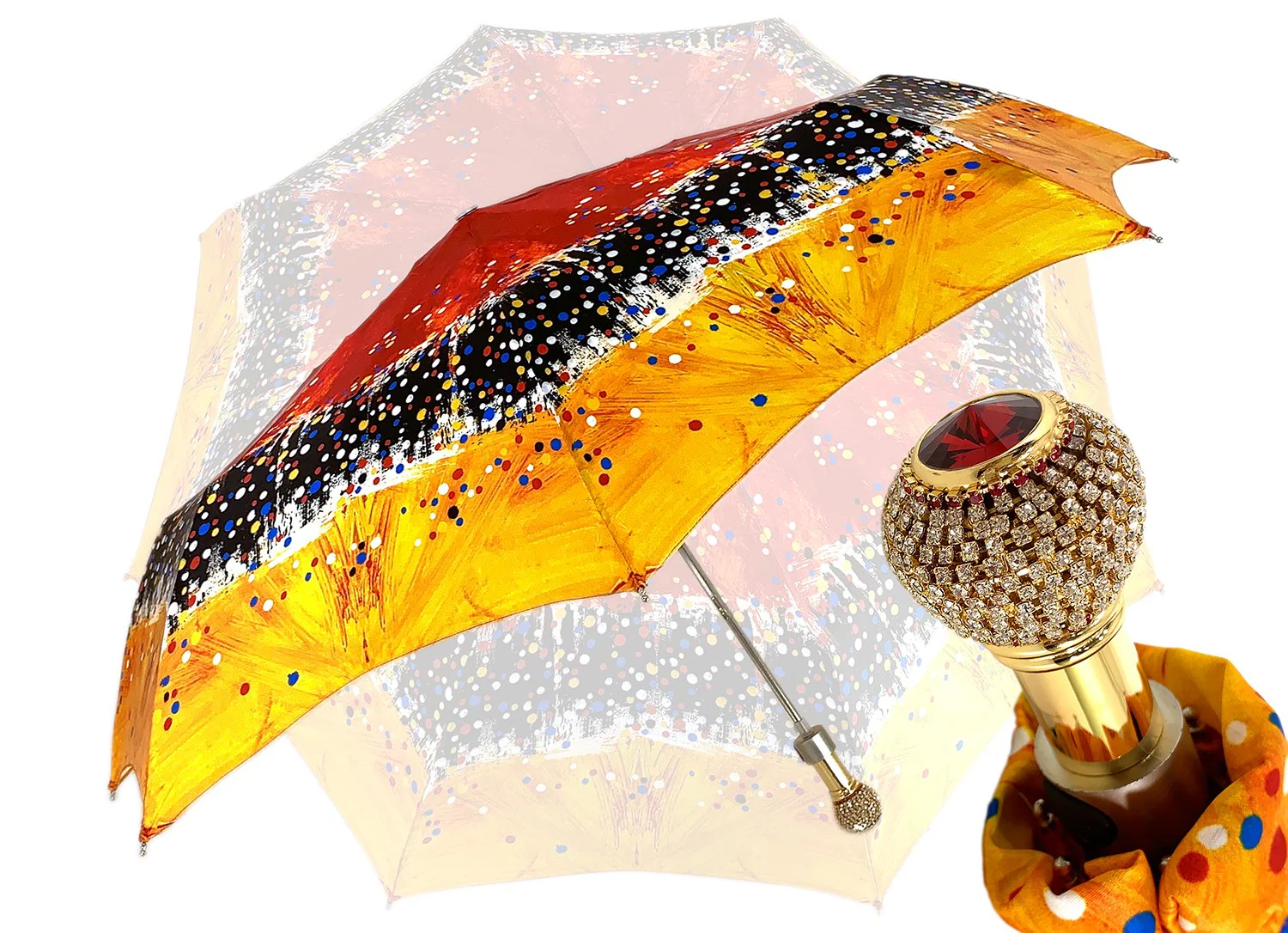 Çadër kompakte projektuesi për femra, hapje automatike e krijuar me mbulesë të projektuar me printim të Kuq, Portokalli dhe të Zi dhe një dorezë luksoze prej ari 24K e veshur me qindra kristale .